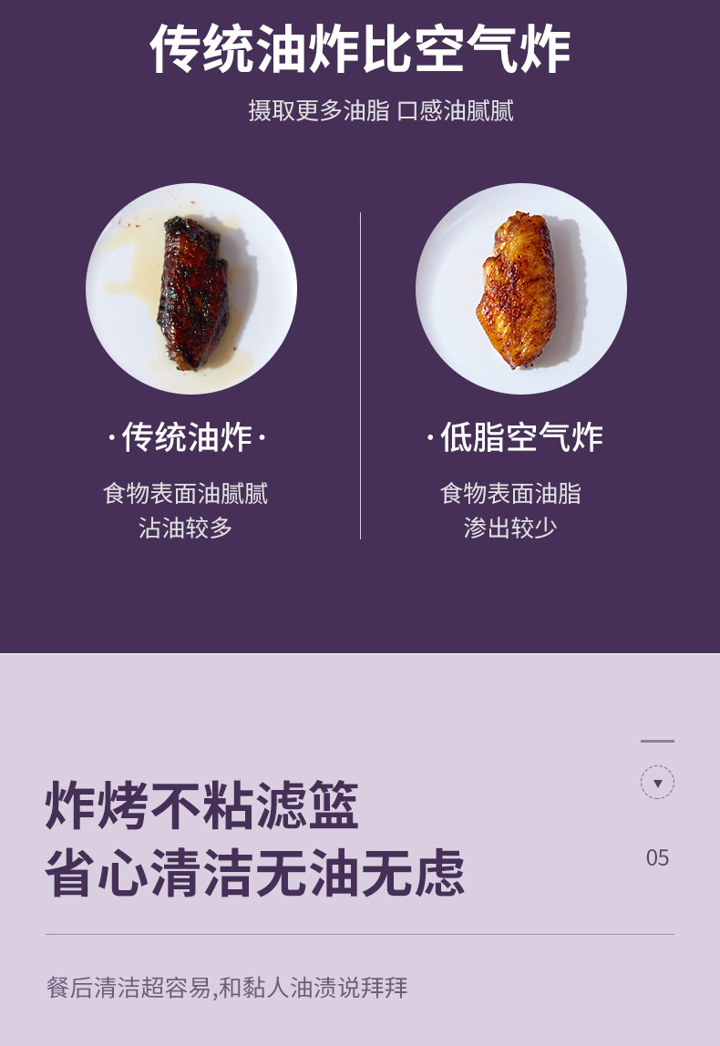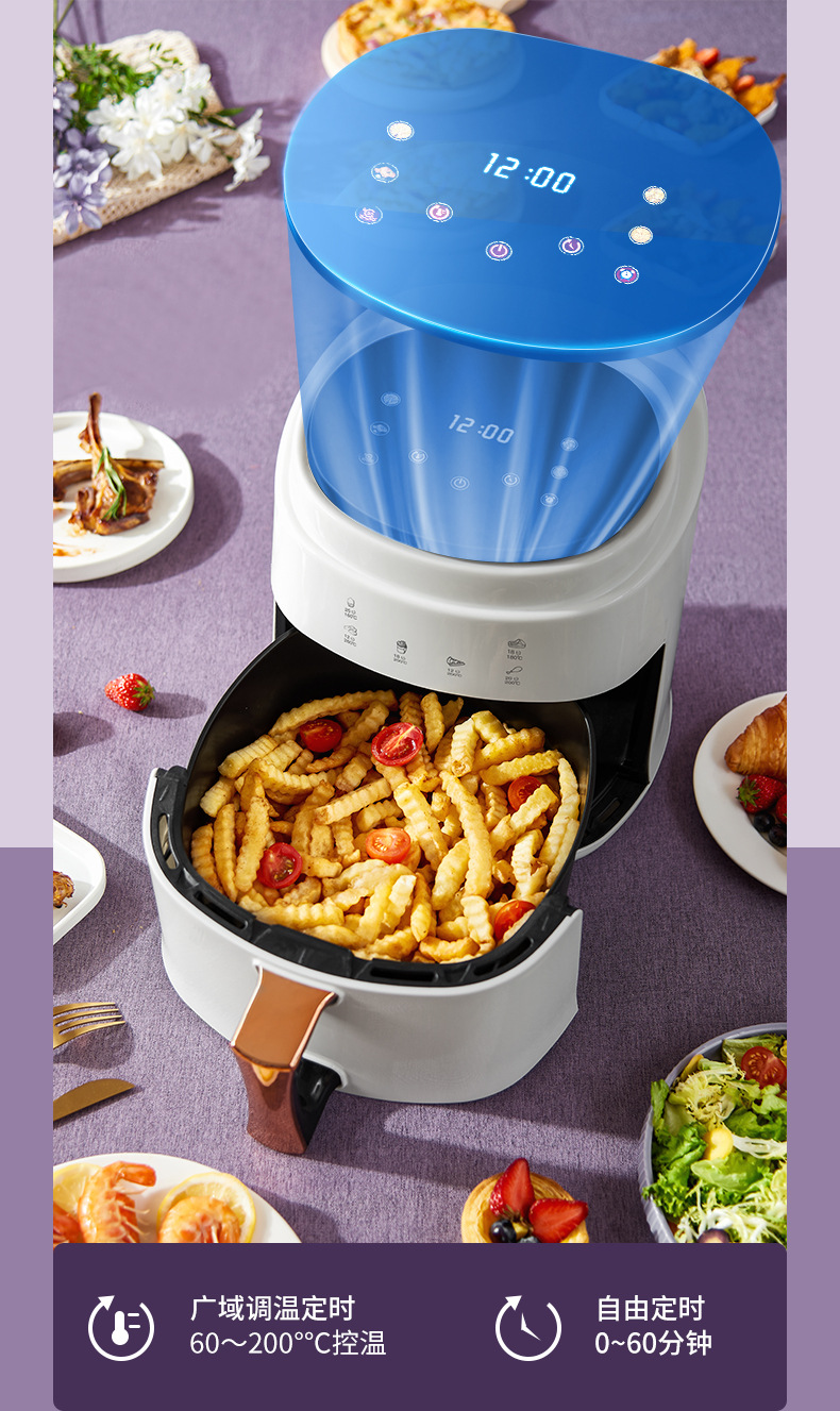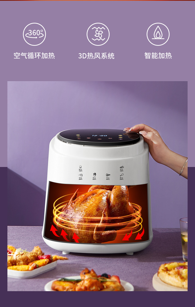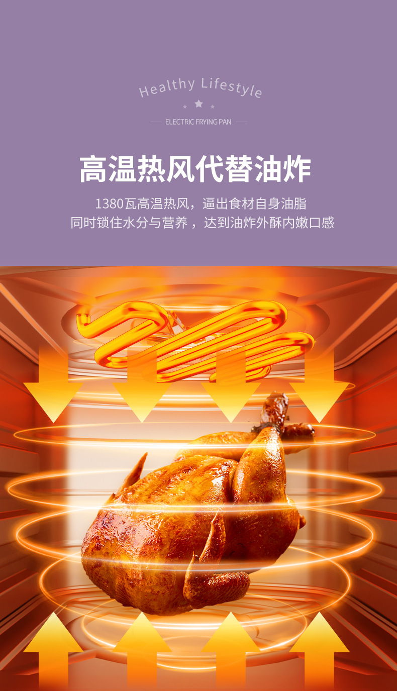 ▸空氣代替熱油,利用熱風360度對流,通過高速熱空煎炸,無油炸鍋,健康美食。