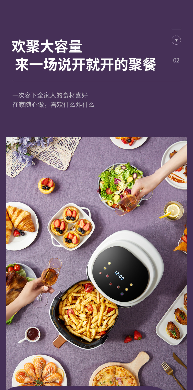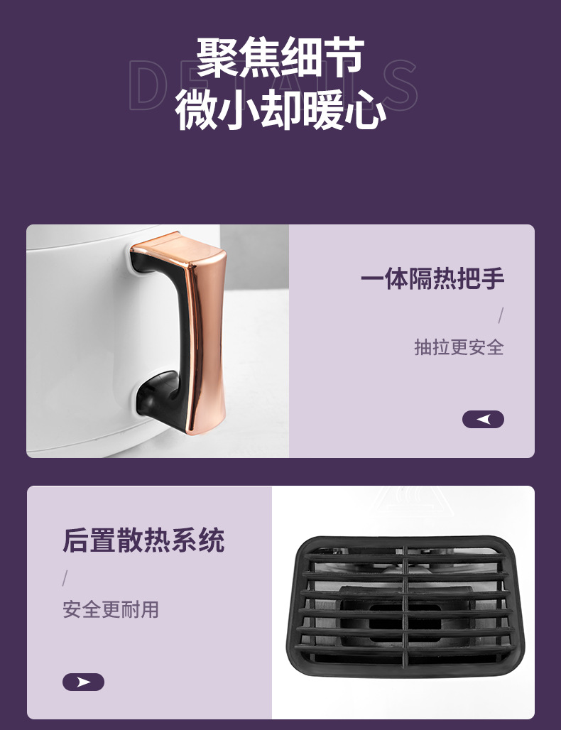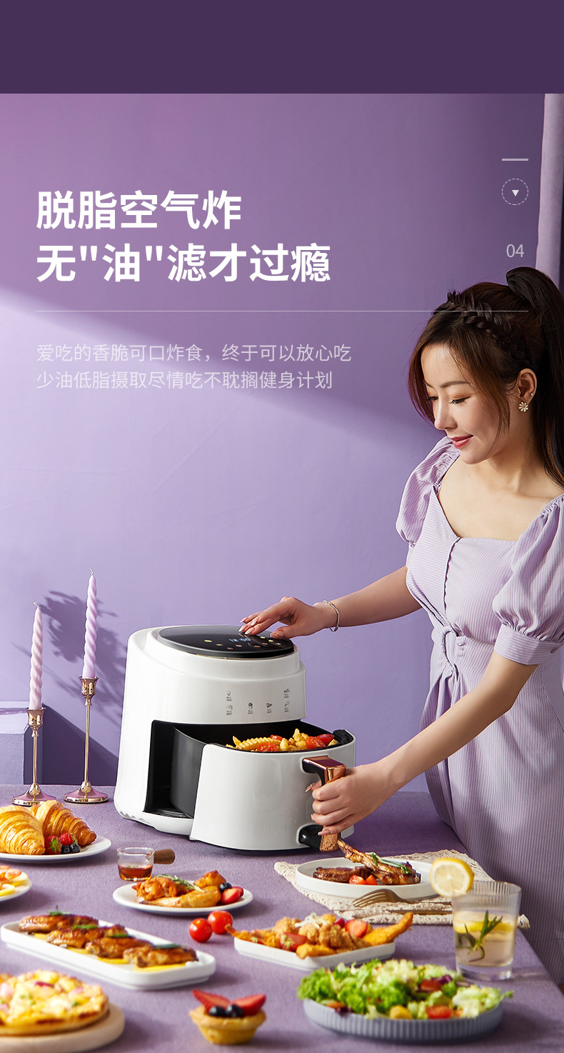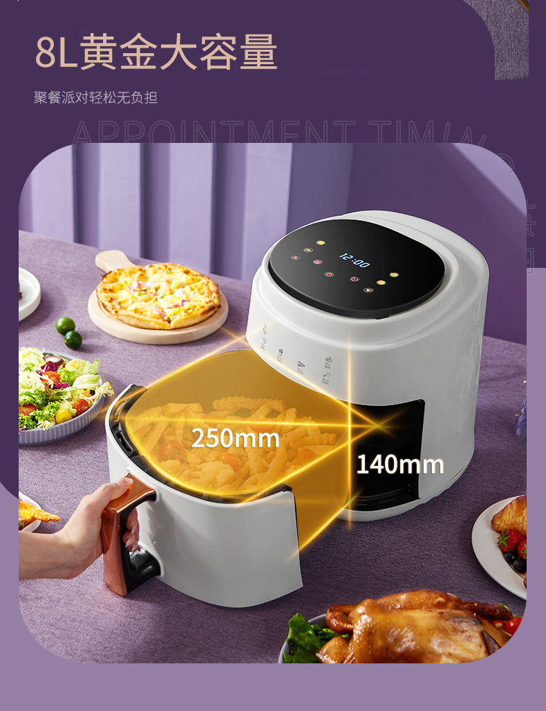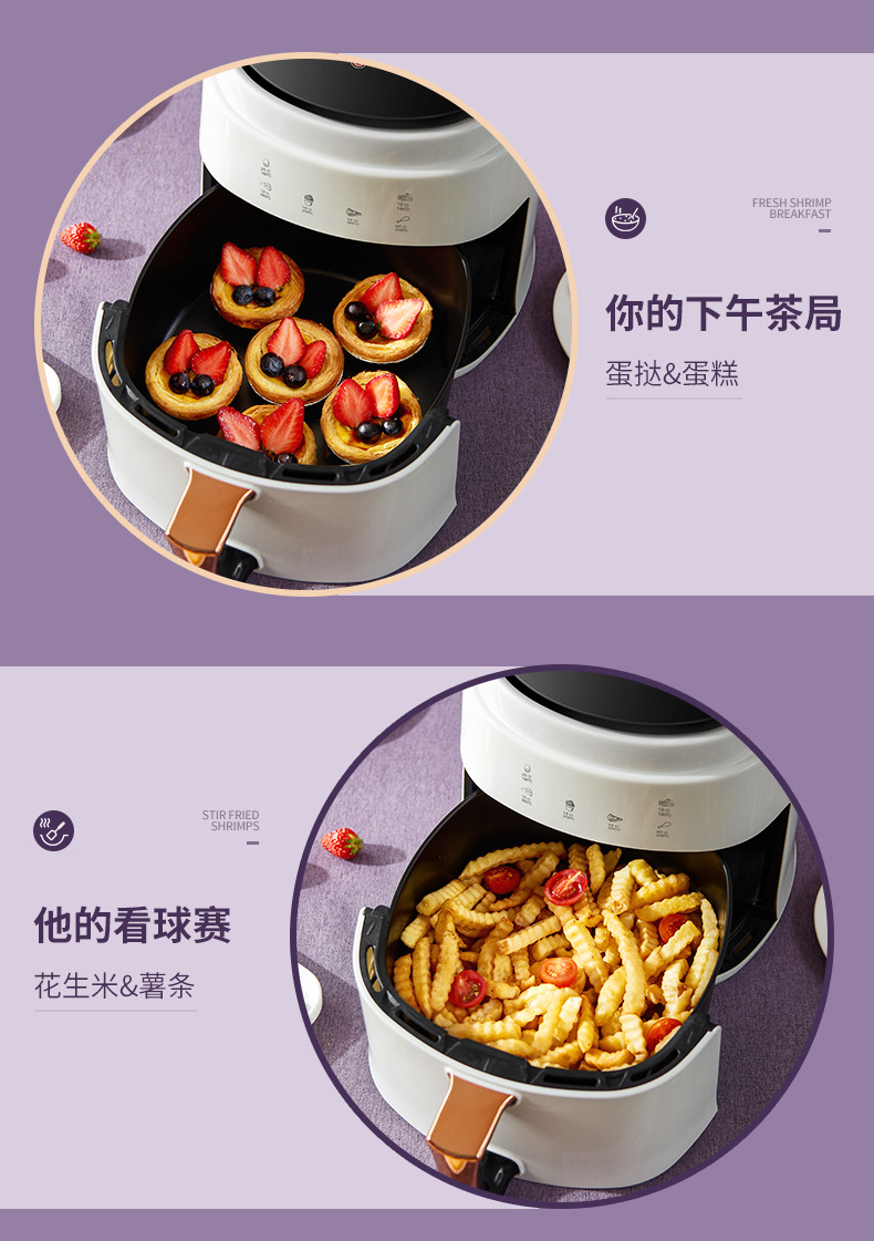 ▸空氣代替熱油,利用熱風360度對流,通過高速熱空煎炸,無油炸鍋,健康美食。