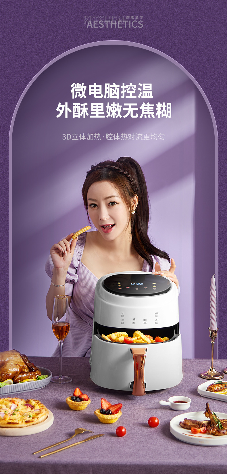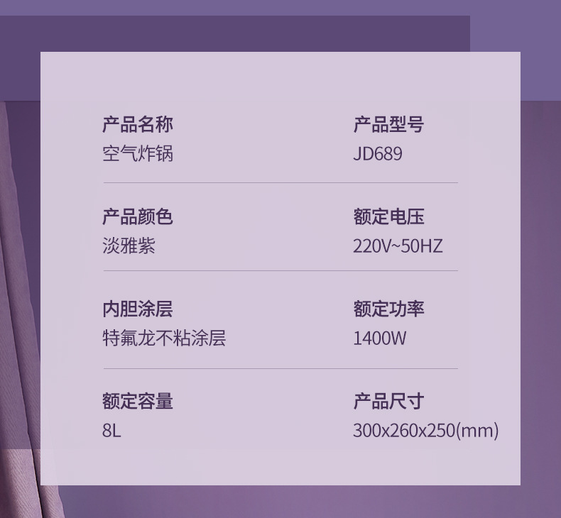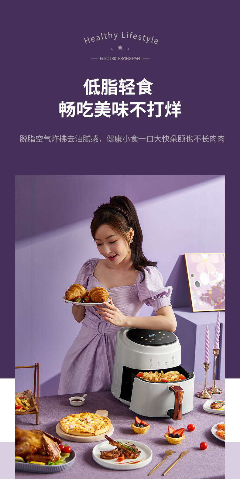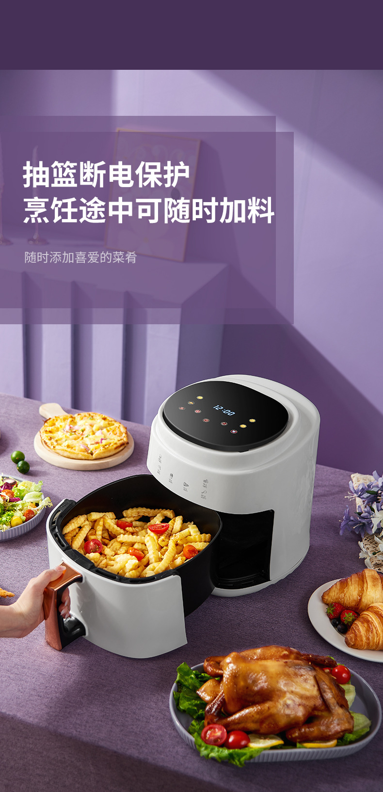 ▸空氣代替熱油,利用熱風360度對流,通過高速熱空煎炸,無油炸鍋,健康美食。