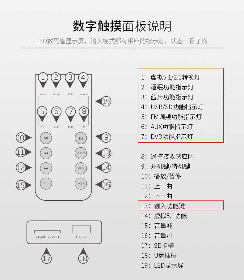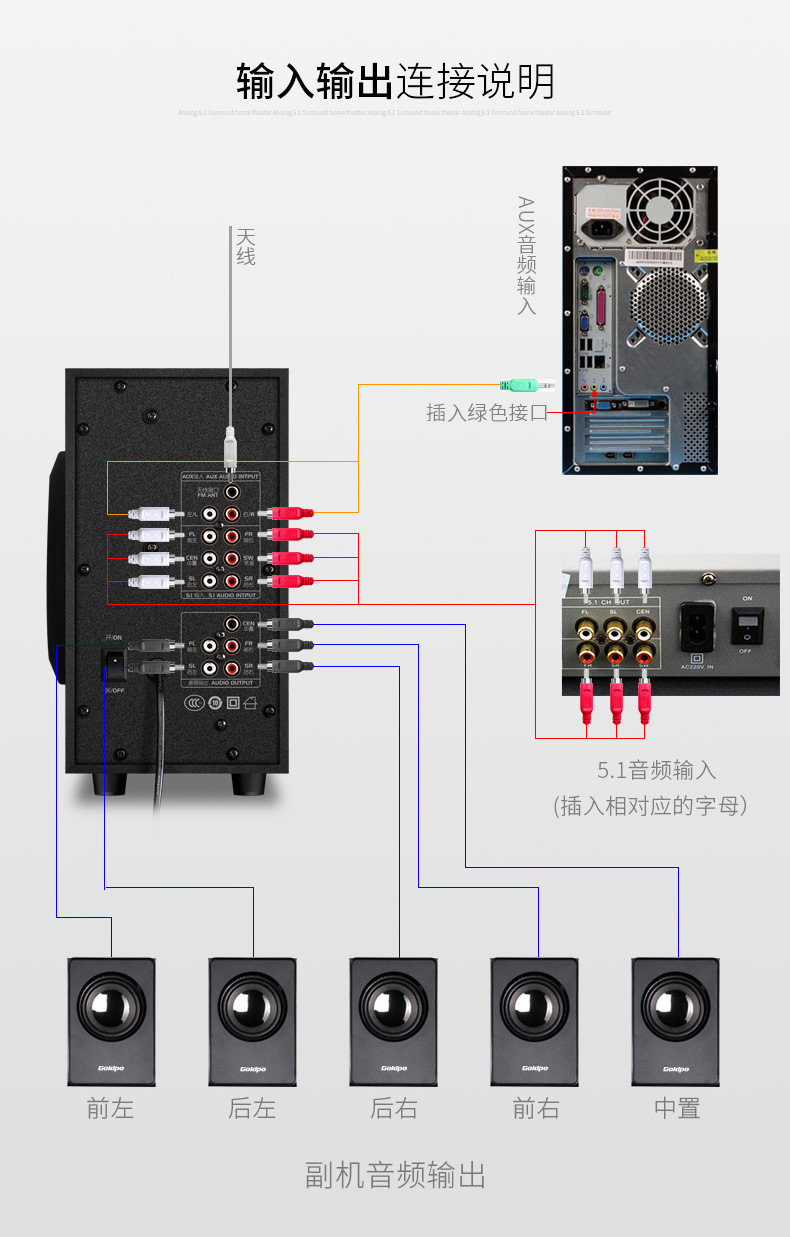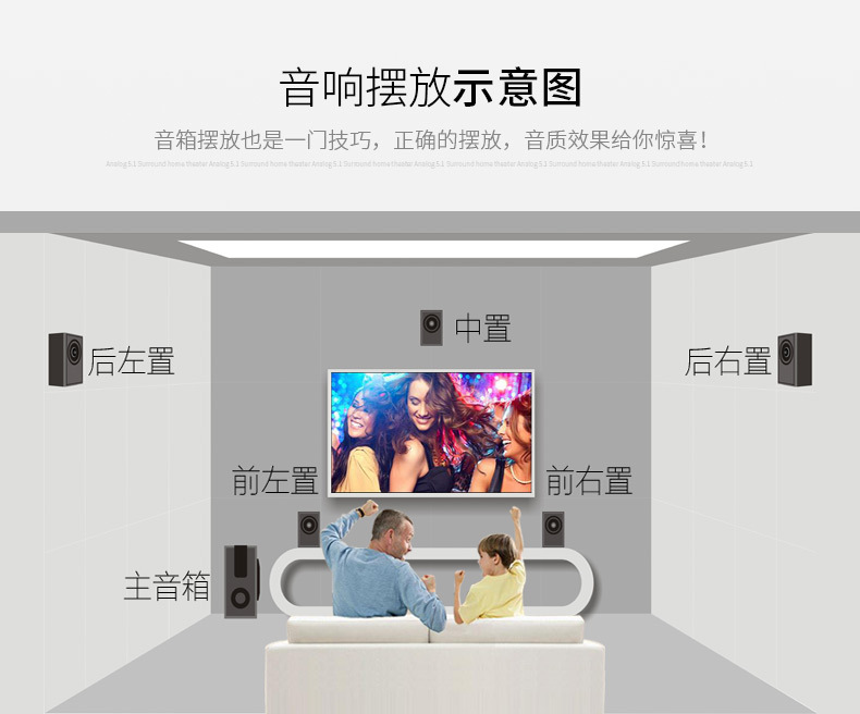 ▸標準5.1模擬輸入接口,獨立6通道功放,達到3D立體環繞音效。