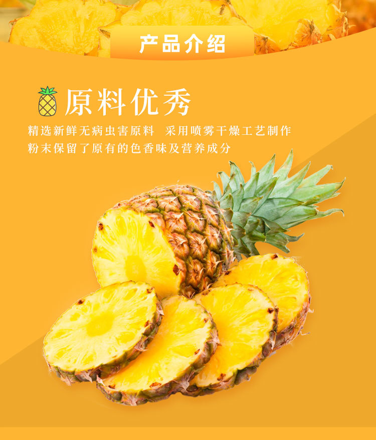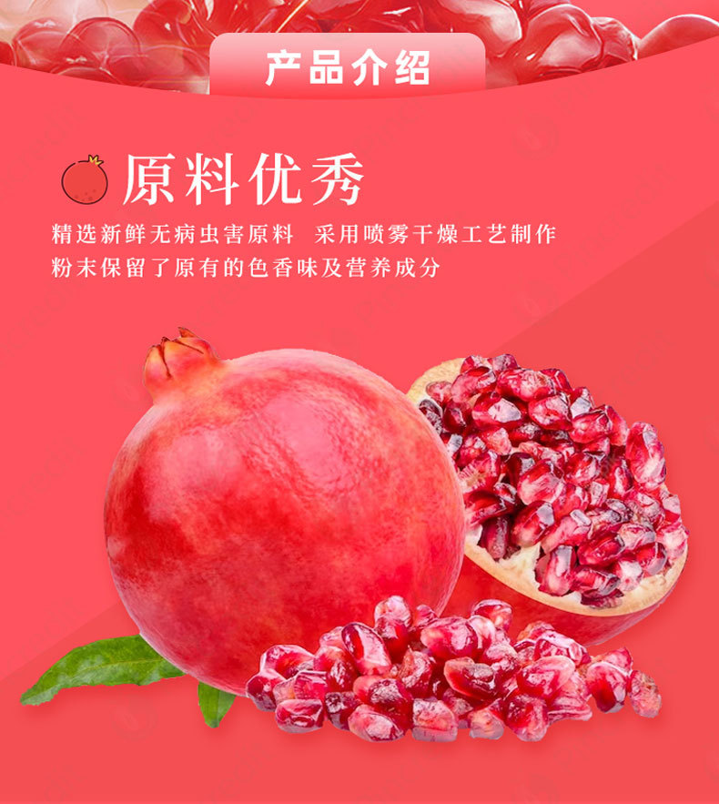 ▸精選新鮮無病蟲害原料,採用噴霧乾燥工藝製作,保留了原有的色香味及營養成分。粉末細膩,疏鬆無結塊,觸感柔軟,色澤自然誘人.