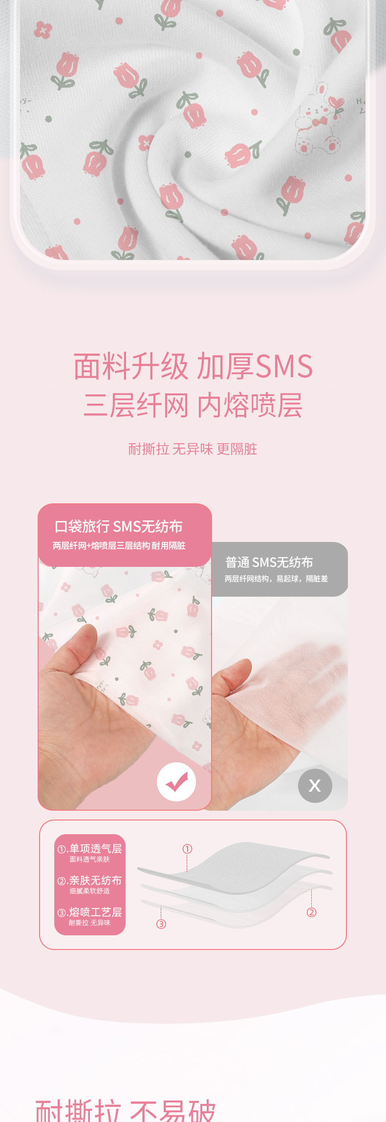 ▸加厚SMS無紡布,兩層纖網+熔噴層結構,耐撕扯,更隔髒。