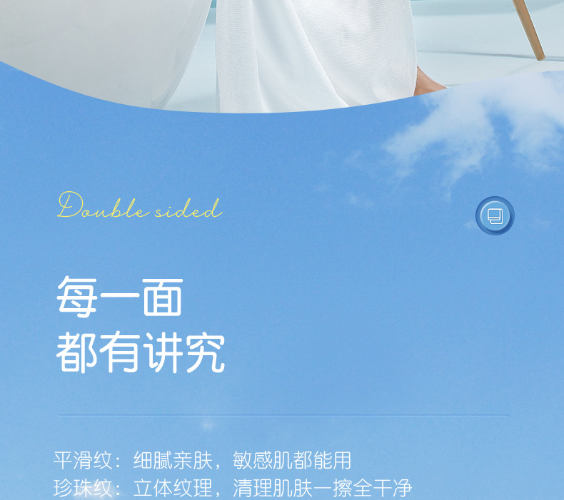 ▸一面為平滑紋,細膩親膚,敏感肌都能用;另一面為珍珠紋,紋理立體,清理肌膚一擦全乾淨。