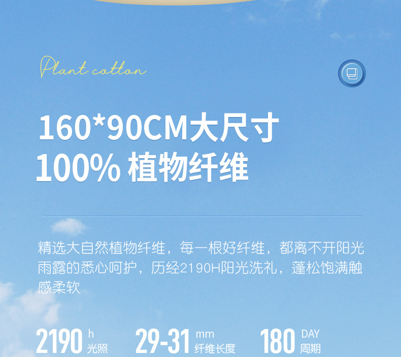 ▸精選大自然植物纖維,歷經2190H陽光洗禮,蓬鬆飽滿觸感柔軟。