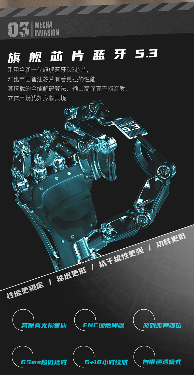 ▸新一代藍牙5.3芯片,輸出高保真無損音質,性能更穩定,抗干擾性更強,延遲更低,功耗更低。