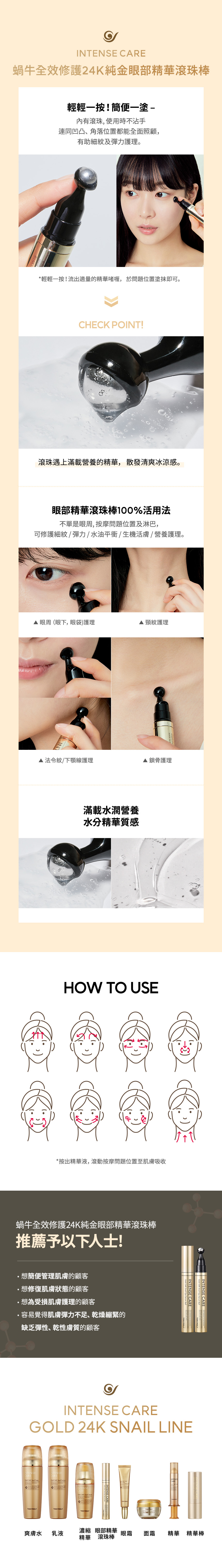 - 蘊含發酵蝸牛黏液24K純金, 使眼部肌膚形成保濕膜, 傳達豐富營養, 加強彈力。