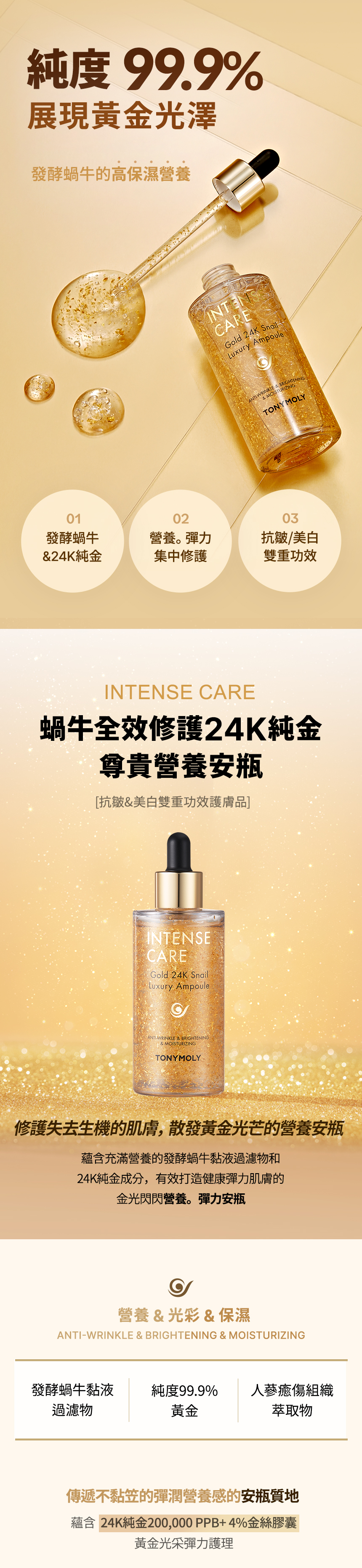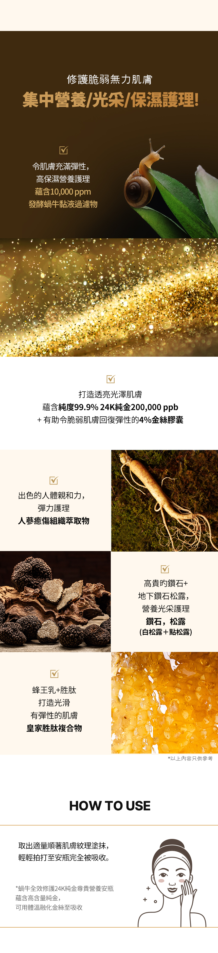 - 蘊含發酵蝸牛黏液24K純金,提升保濕,營養等護膚功效。