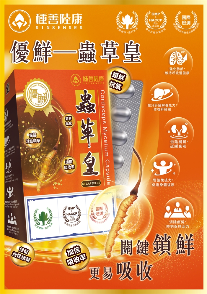 選用頂級冬蟲夏草分離所得的菌種培植發酵而成,當中的蟲草成分包括:蟲草多醣、腺苷、蟲草酸都屬高濃度及高穩定性,功效更為顯著,非其他培植蟲草可媲美;再結合有「菌中至尊」之稱的姬松茸、「心臟的保護神」之稱的輔酶Q10、專利BioPerine®胡椒鹼,提升吸收率,發揮強效的作用。 《種善陸康-優鮮蟲草皇膠囊》除精選上乘專利原材料,更嚴謹監控生產,鎖鮮抗氧,保留活性精華成分,務求品質功效發揮至最佳。