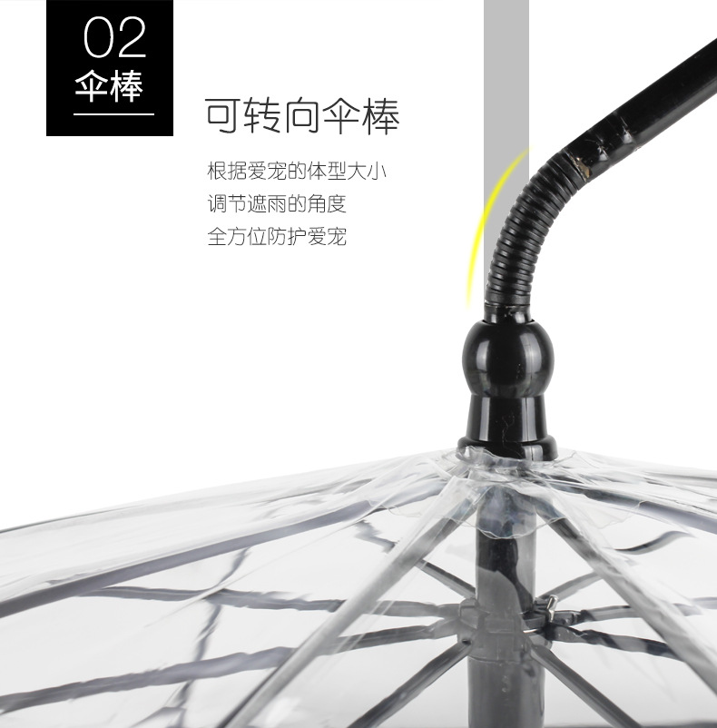 寵物雨傘解決了您在雨天無法帶著愛寵出門的煩惱!▸可轉向傘棒:可根據愛寵的體型大小調節遮雨的角度