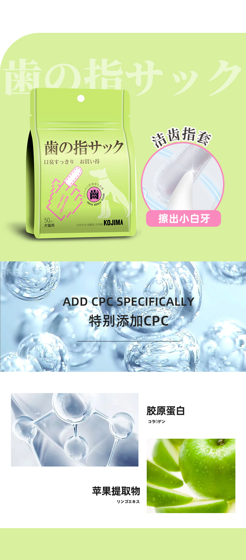 潔齒指套:EDI水、無紡布、銀離子、蘋果提取物、CPC、甘油、水解膠原蛋白、玫瑰提取物等