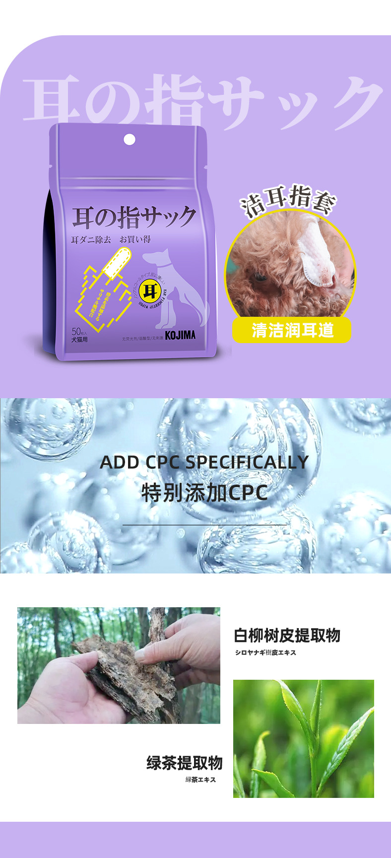 潔耳指套:EDI水、無紡布、甘油、白柳樹皮提取物、CPC、積雪草提取物、綠茶提取物等
