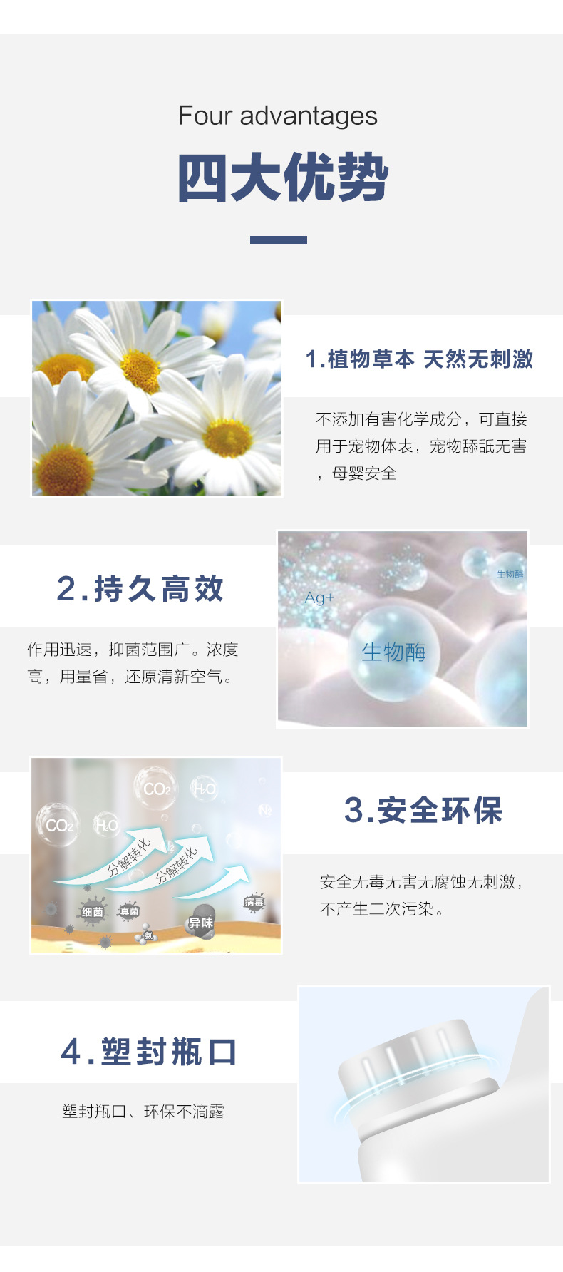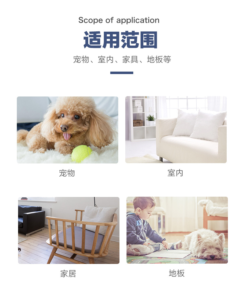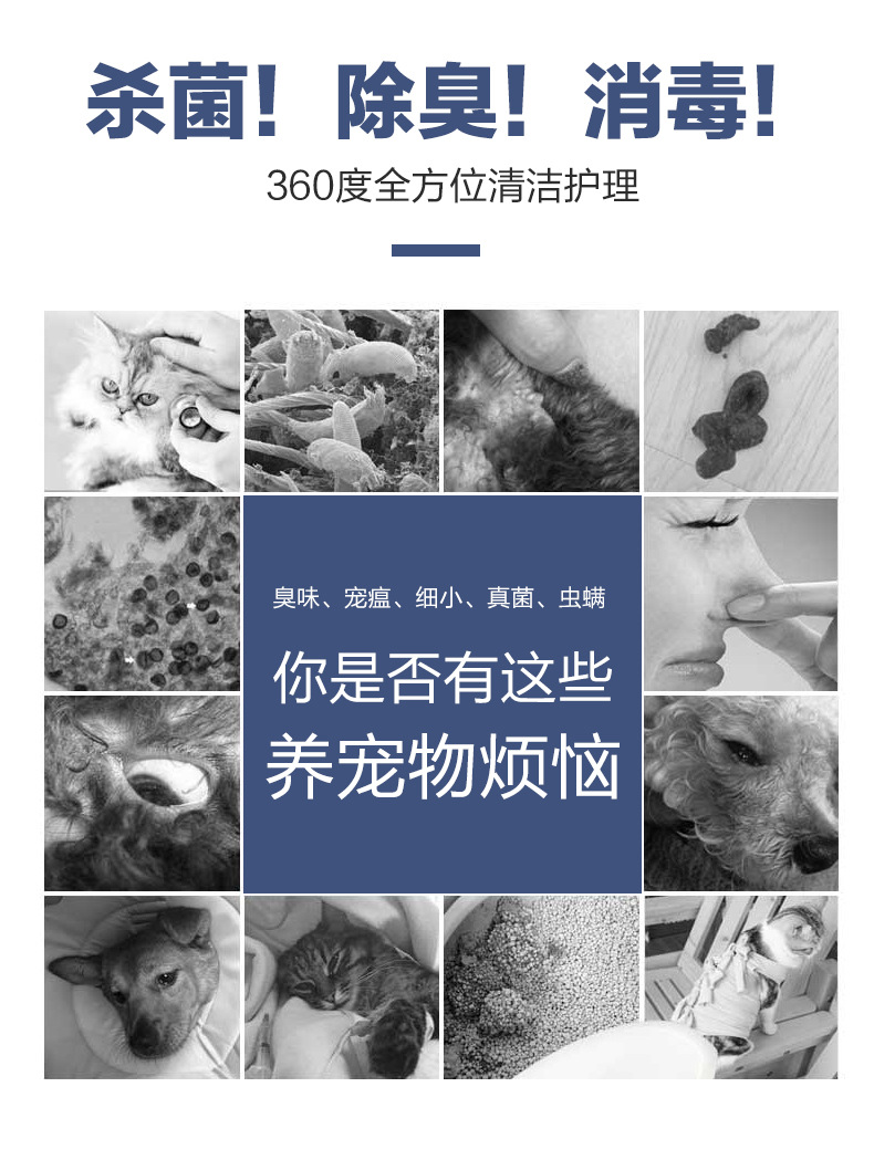 適用范圍:寵物醫院、寵物美容院、寵物家庭等,用於環境、寵物身體、籠子、家居、窩具等。