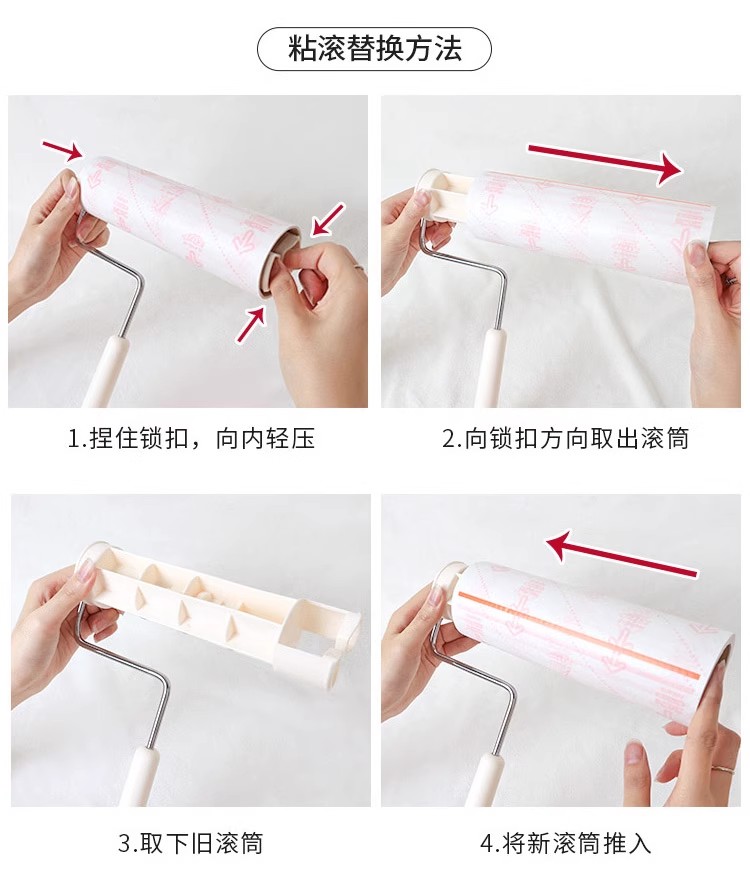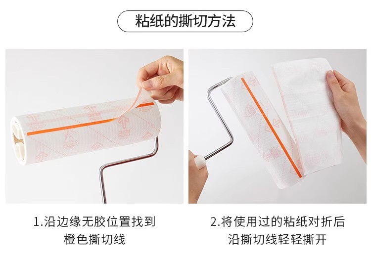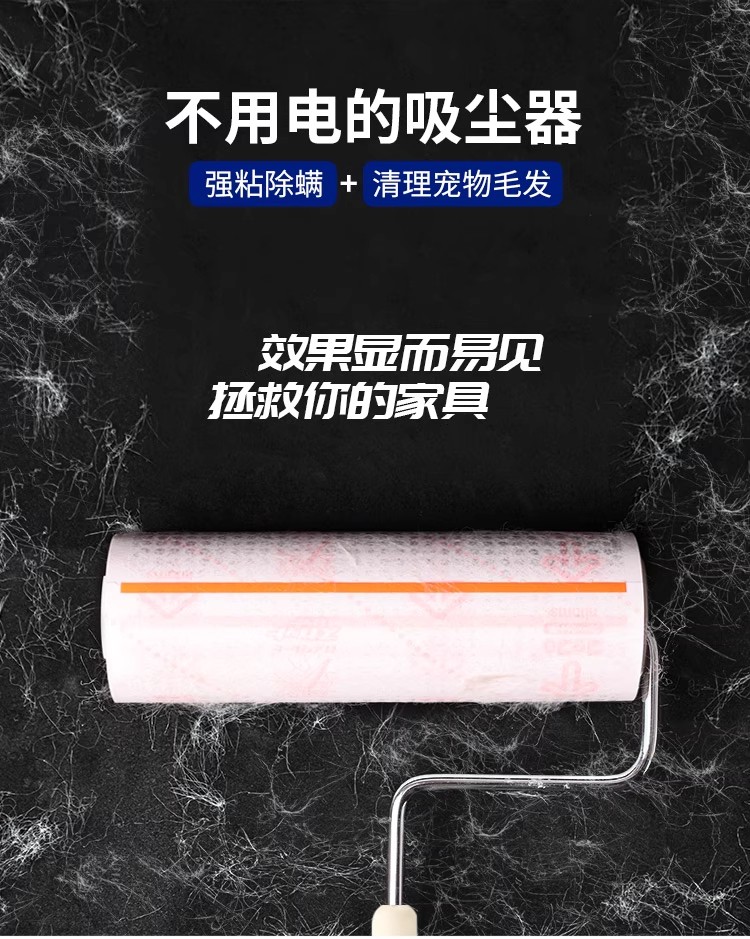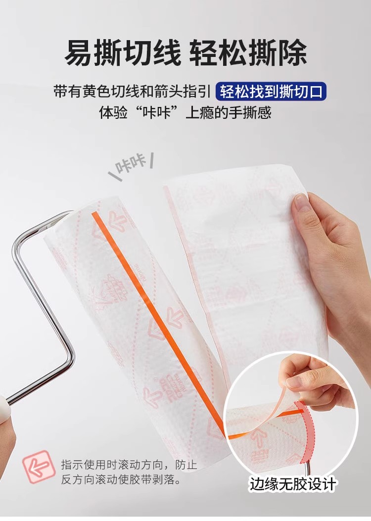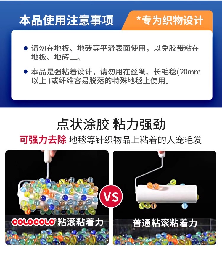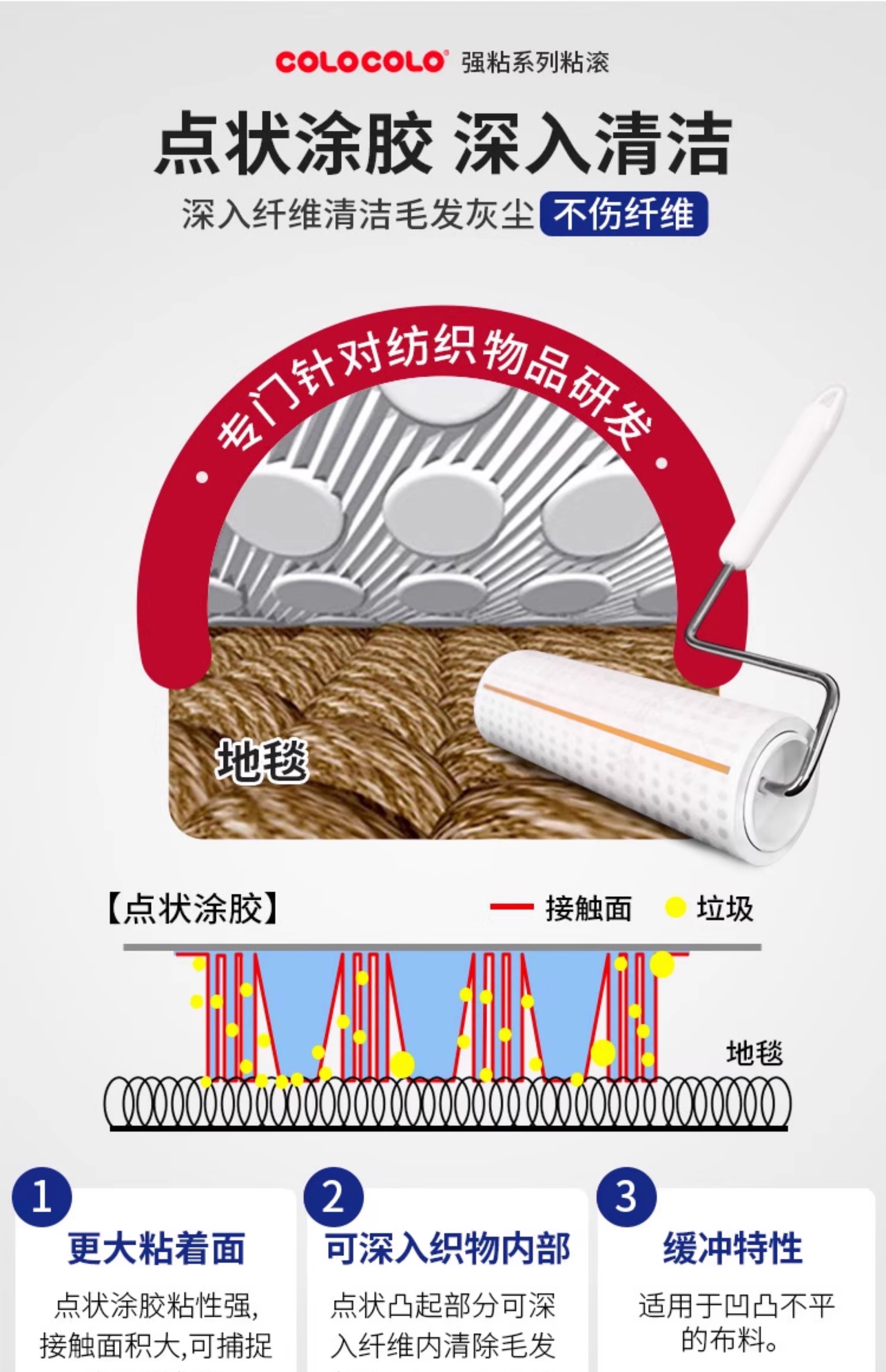點狀塗膠黏性強,深入織物内部清除毛髮灰塵,不傷纖維。(*本產品專為織物設計,請勿在地板、地磚等平滑表面使用。由於產品的强黏性,也請勿在絲綢、長毛毯等纖維易脫落的表面上使用。)