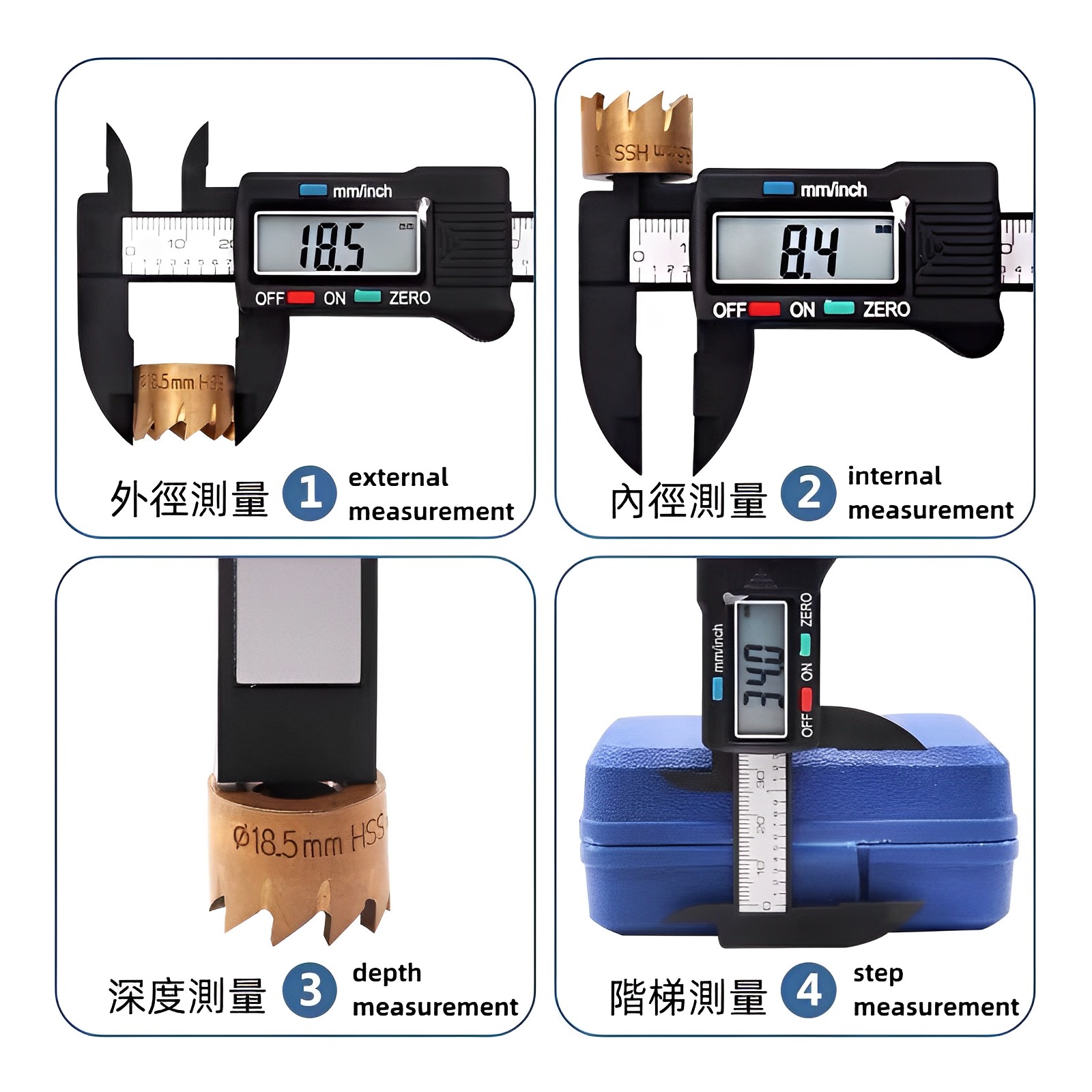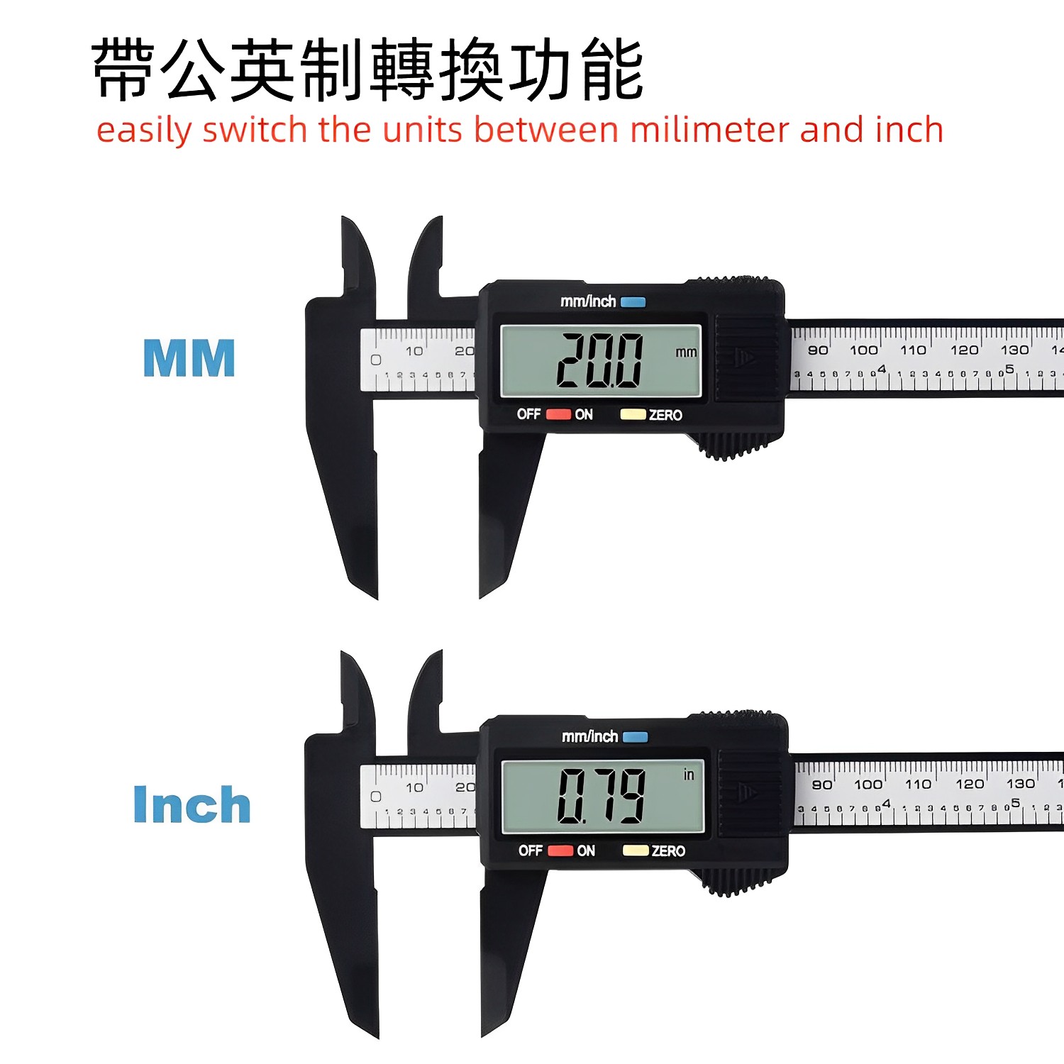 ✓數字顯示,帶公英制轉換功能✓四種測量方式:外徑、內徑、深度、台階✓帶拉顯功能,拉鬆卡尺即刻顯示✓5分鐘不用自動關機