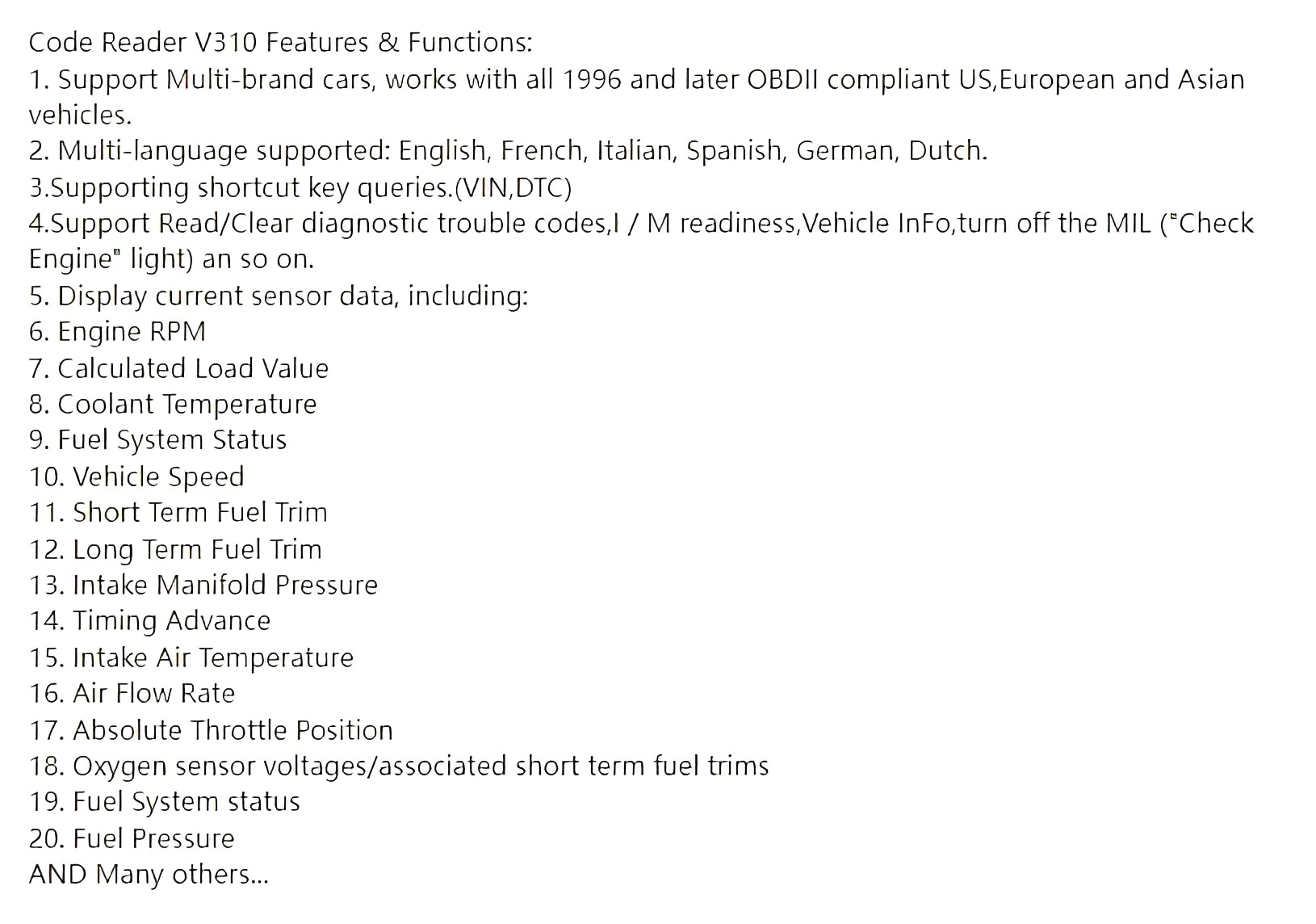 ✓經典手持式設計 OBD2 掃描儀,即插即用,專為汽車診斷代碼初學者而設✓廣泛兼容 ,支持 9 種協議7種語言✓以圖形和文本形式提供實時數據,直接顯示測試結果✓多功能汽車掃描儀 ,輕鬆檢查發動機錯誤