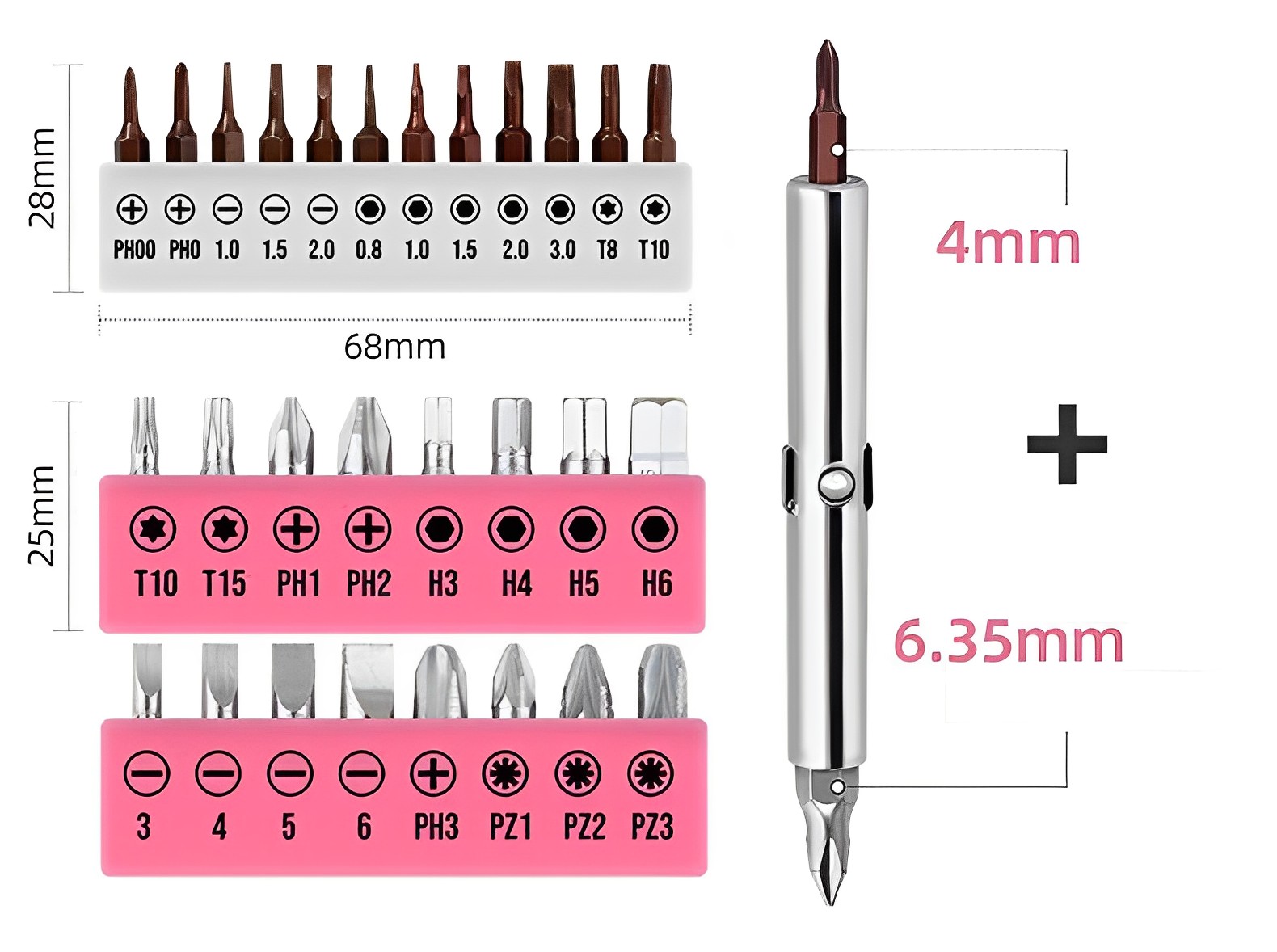 ✓2合1批頭手柄,適用4mm/6.35mm兩種直徑批頭✓16件鉻釩合金鋼批頭✓12件S2合金鋼精密批頭