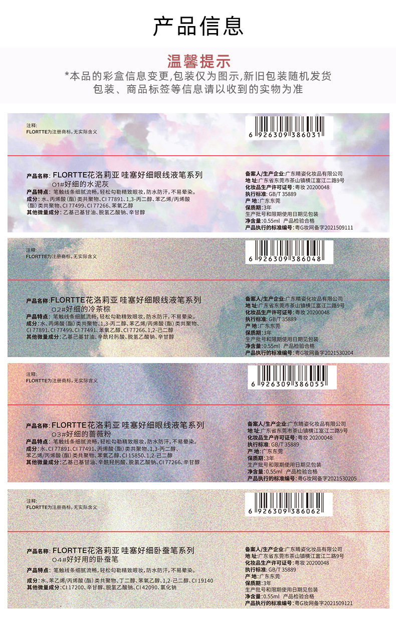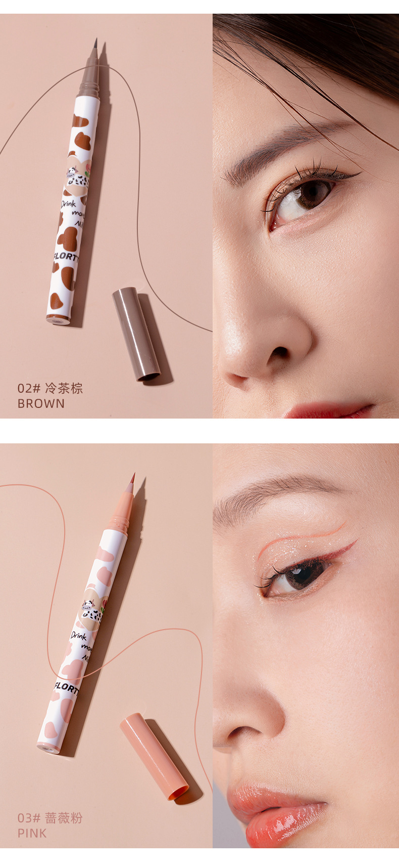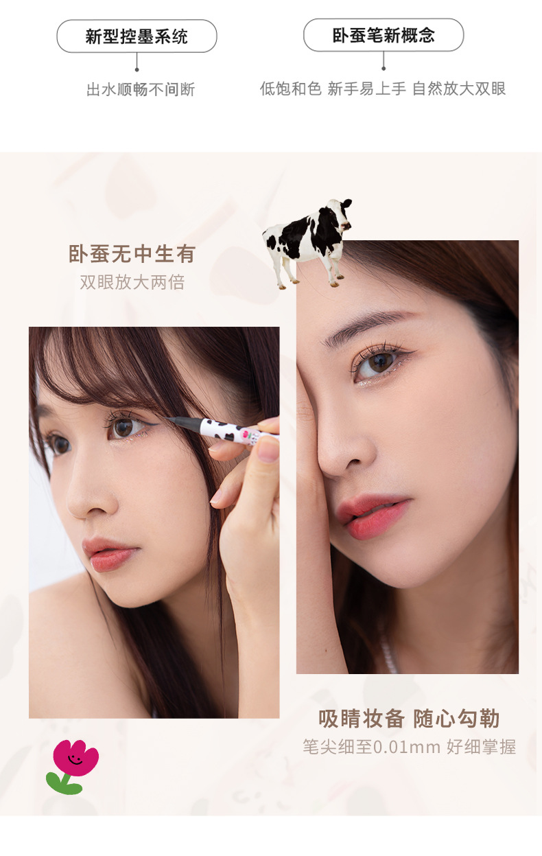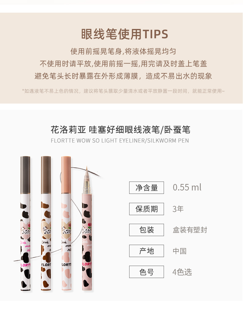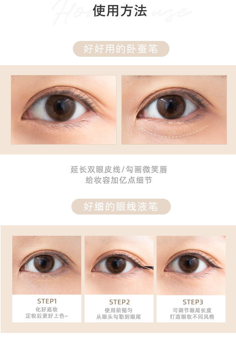 使用方法:建議先畫好底妝以獲得更好的顏色效果;使用前輕輕搖晃筆身,沿著眼睛輪廓描繪至眼尾,根據自己的妝容調整長度,最後描繪睫毛根部以獲得精緻的大眼效果。