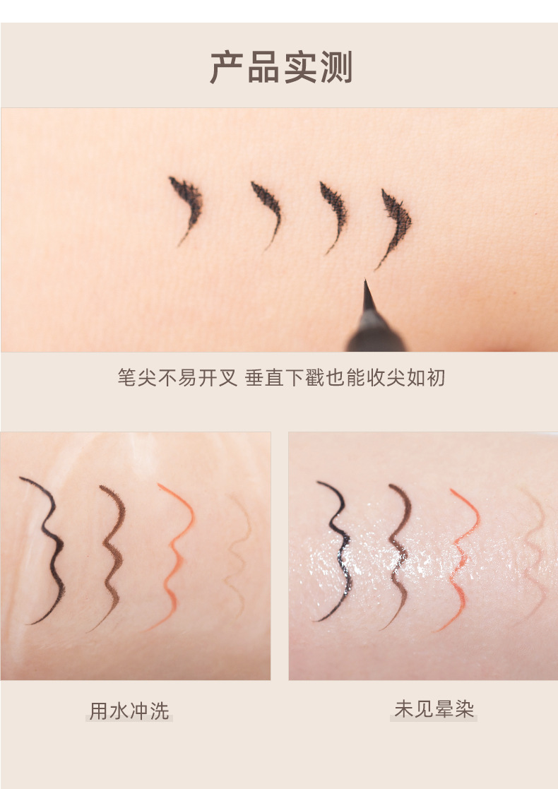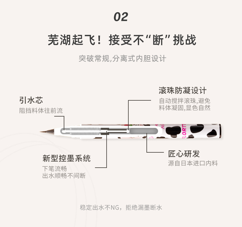 特點與功效:產品的筆尖由定制鬃毛製成,內部有引水芯和滾珠防凝設計,配合雙重成膜技術,以達到防水、防擦和防暈染效果,持妝時間長。