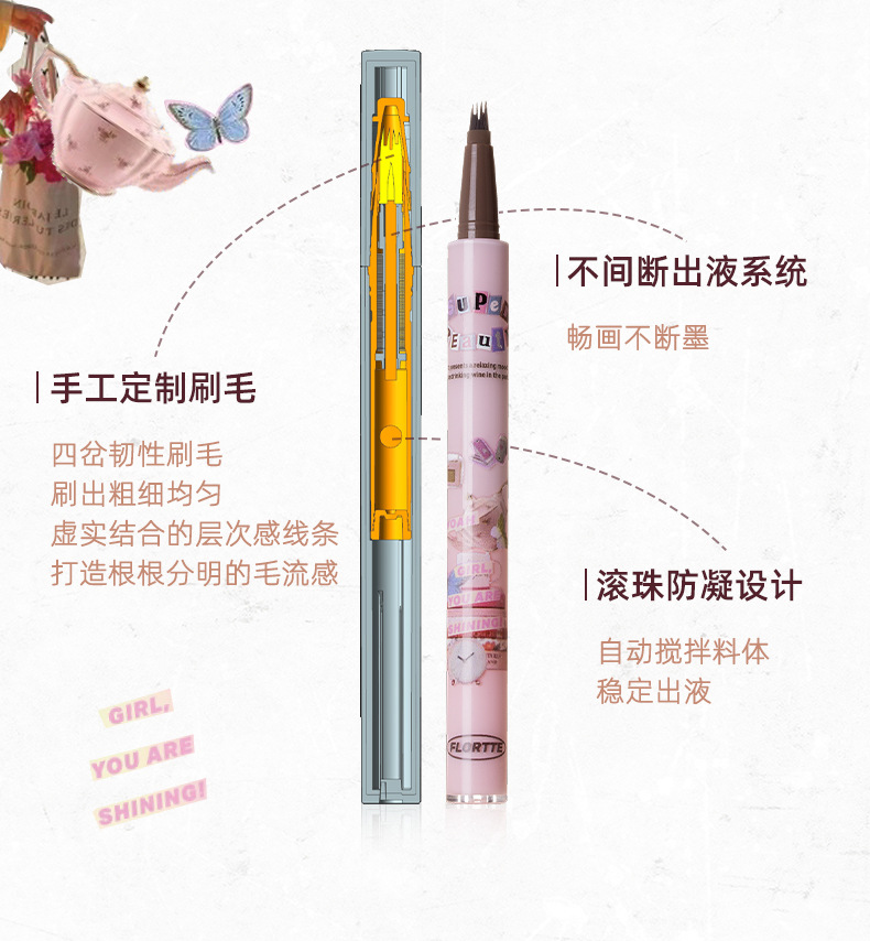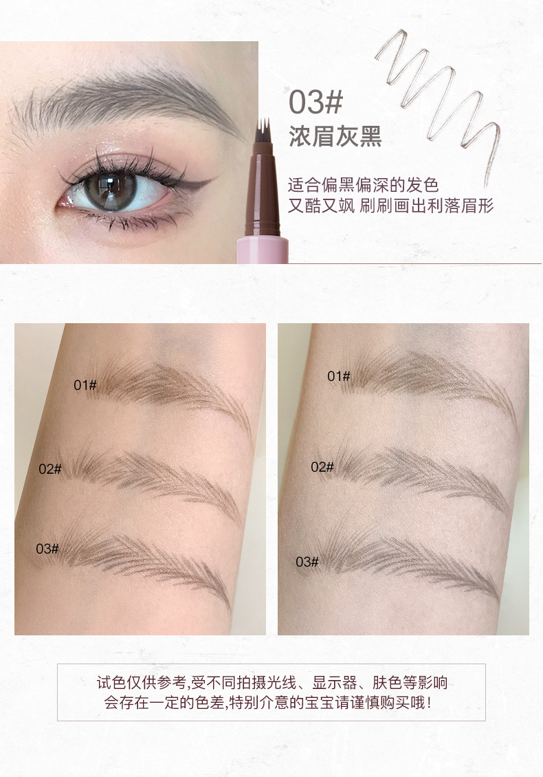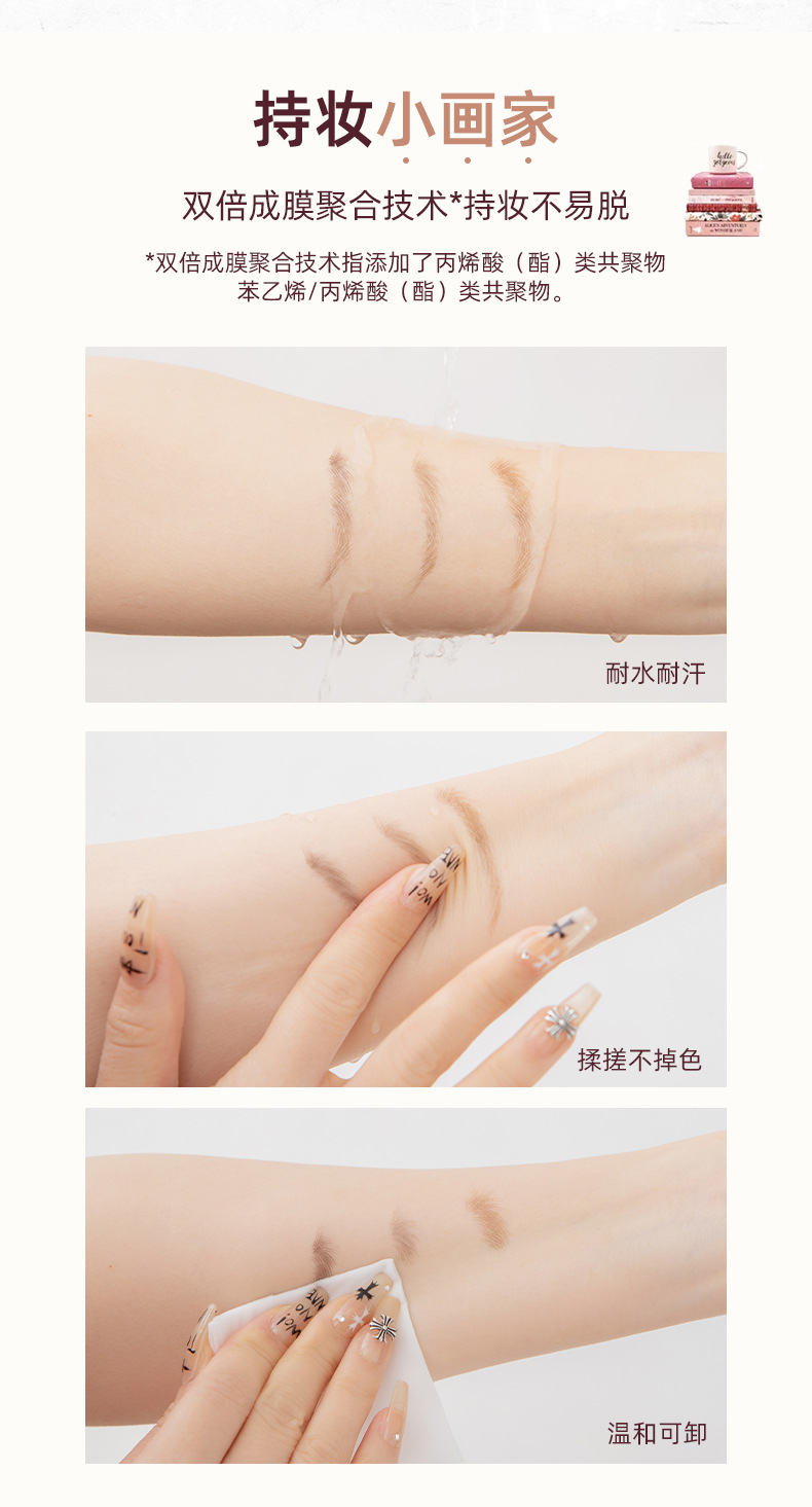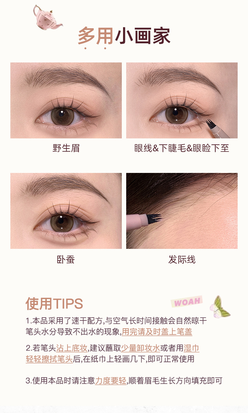 小貼士:本產品採用快乾配方,使用後請及時蓋上筆蓋,防止筆頭長時間接觸空氣導致無水現象;如果筆頭沾上底妝,建議蘸取少量卸妝產品或用濕毛巾輕輕擦拭筆頭,以確保供水穩定正常使用;使用本產品時,請輕輕填充眉毛生長方向,不要過度使用!