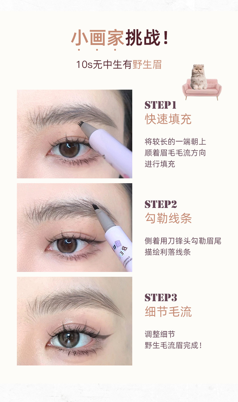 使用方法:按照眉毛生長方向填充,長端朝上,用刀片刷頭側面勾勒眉尾,描繪出銳利的線條,調整細節,完成野生眉。
