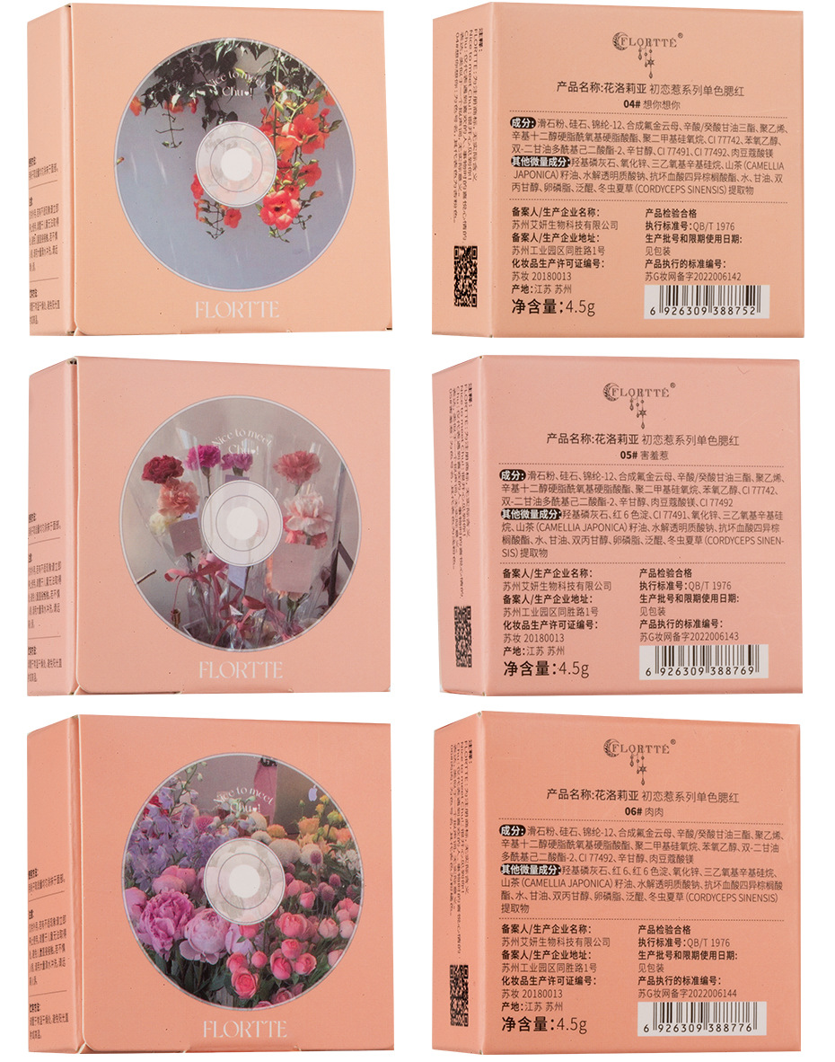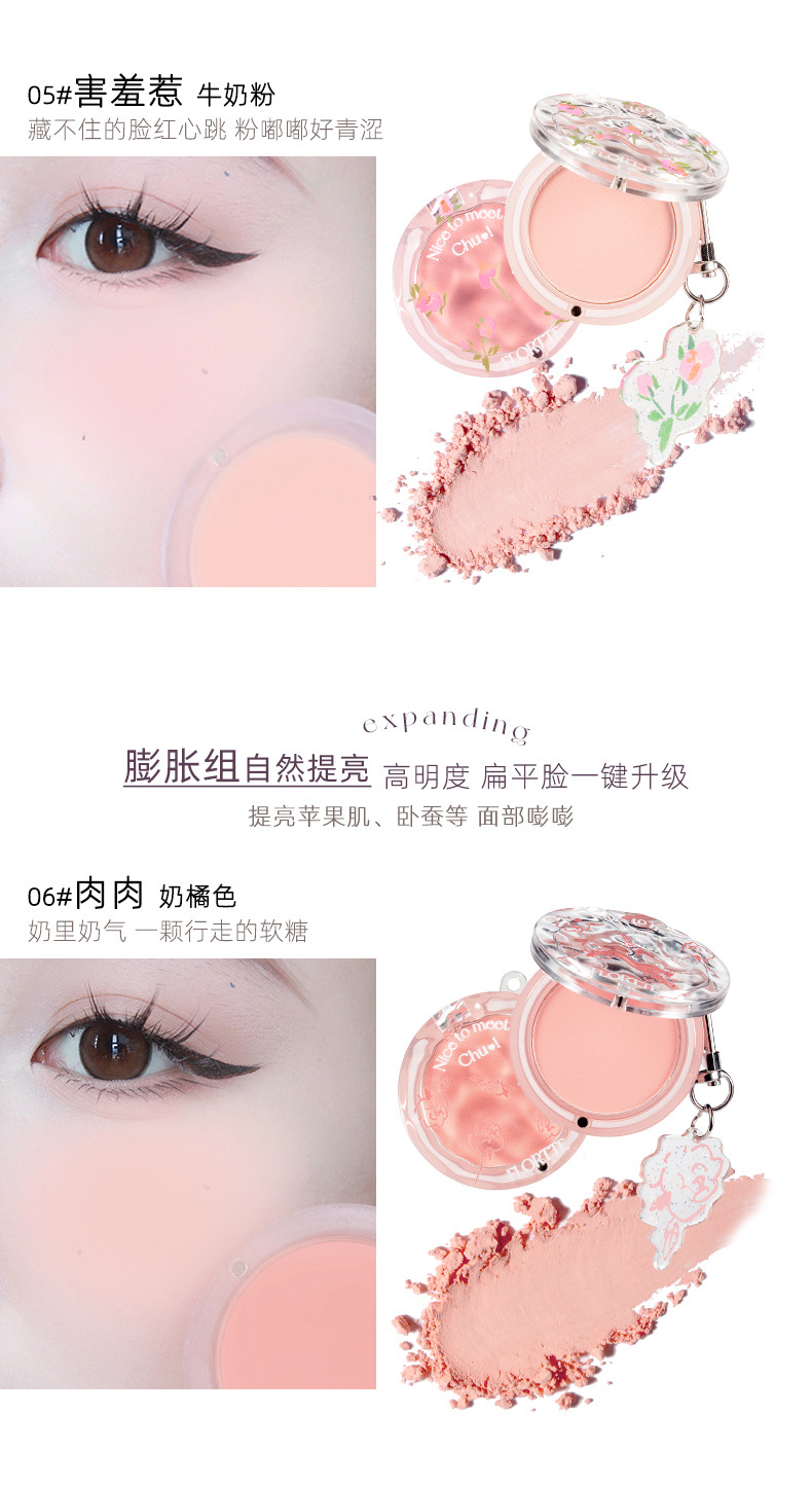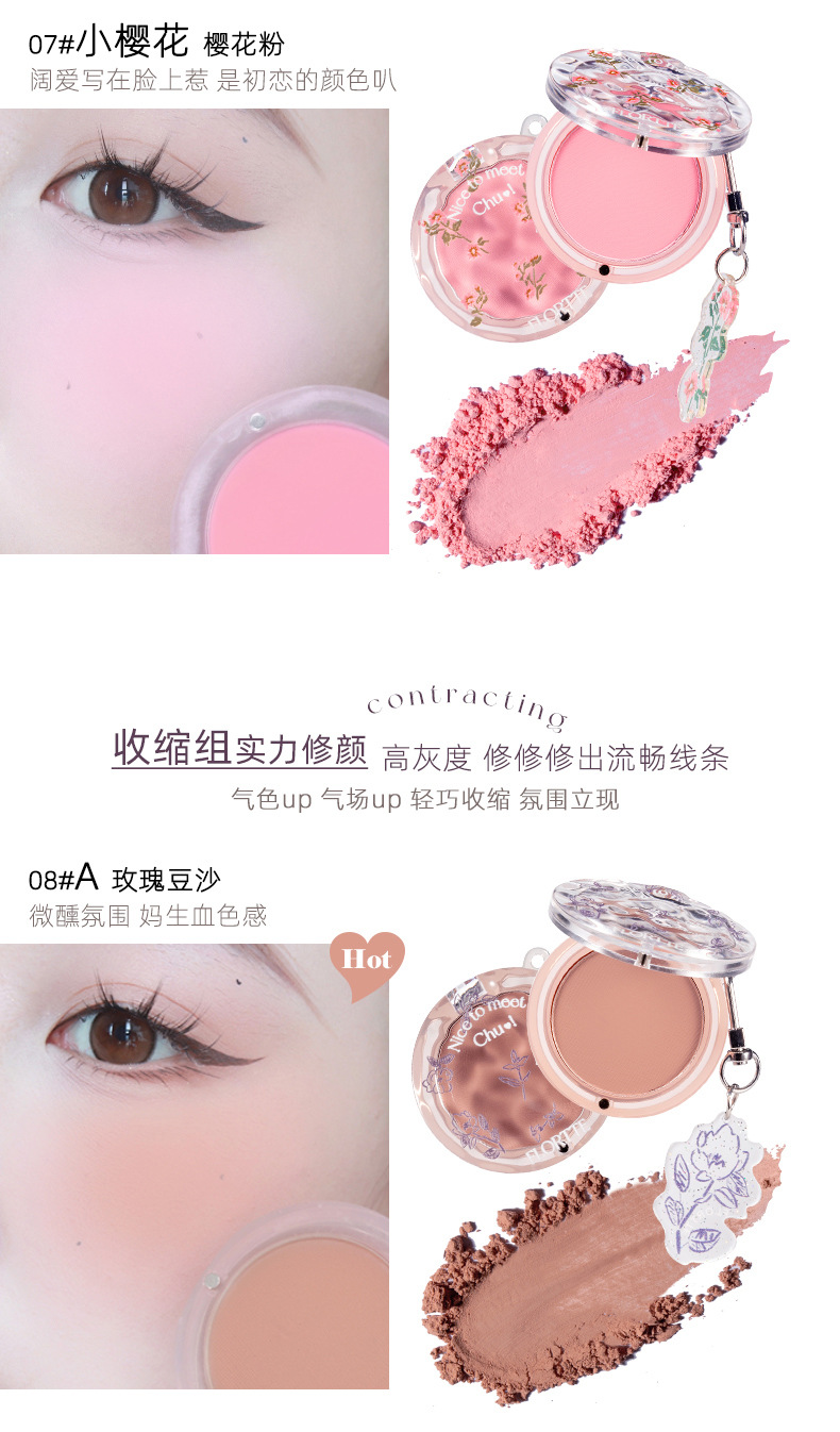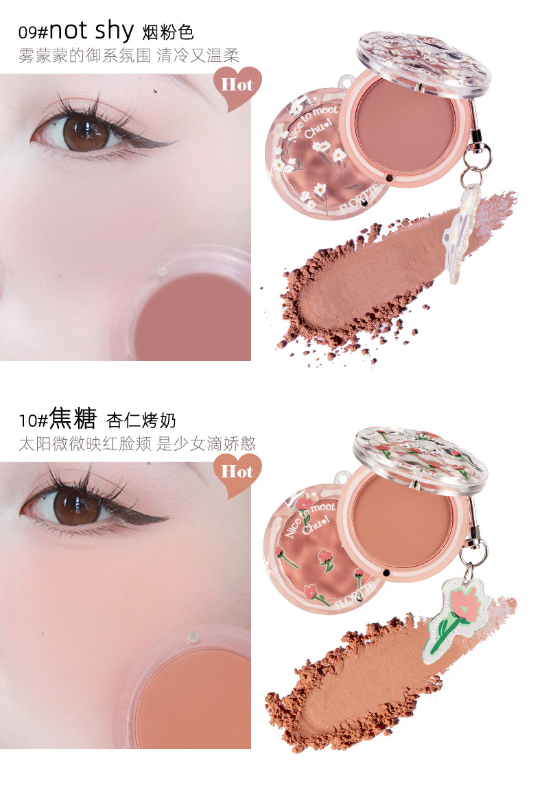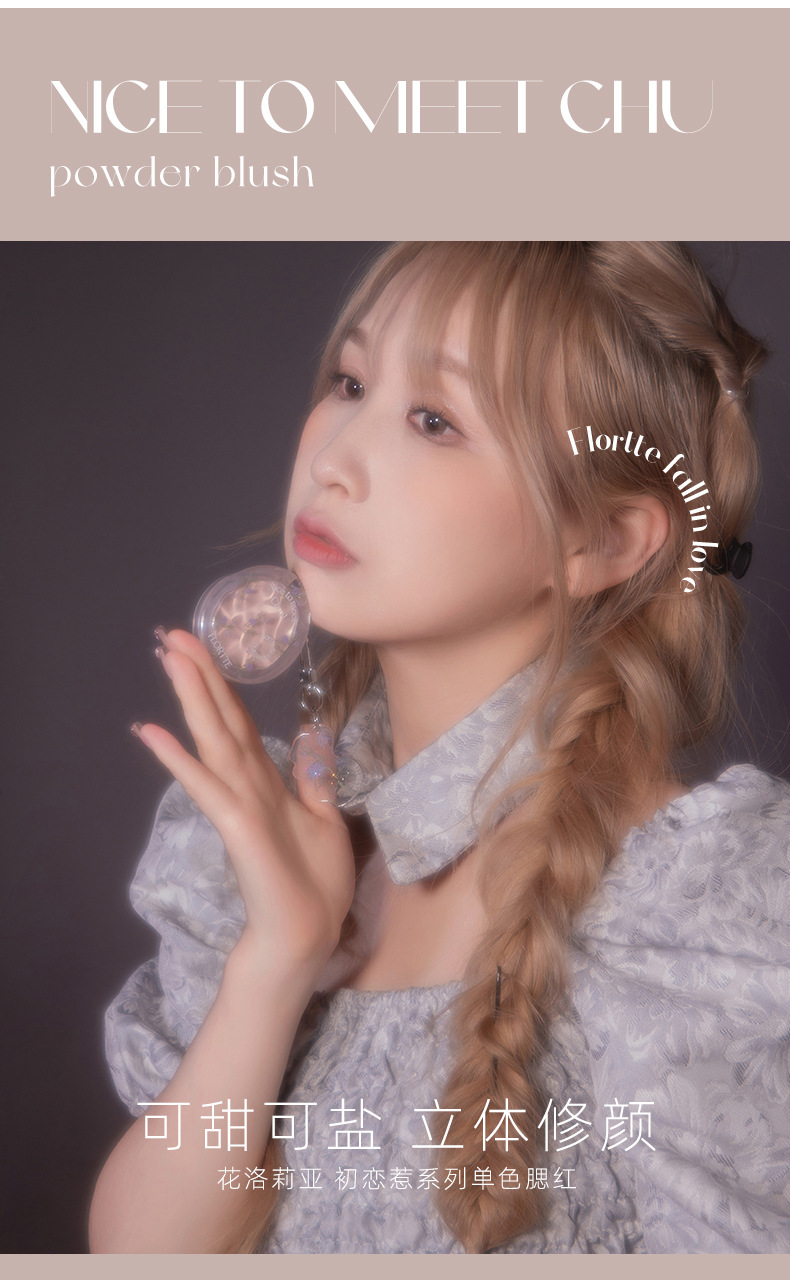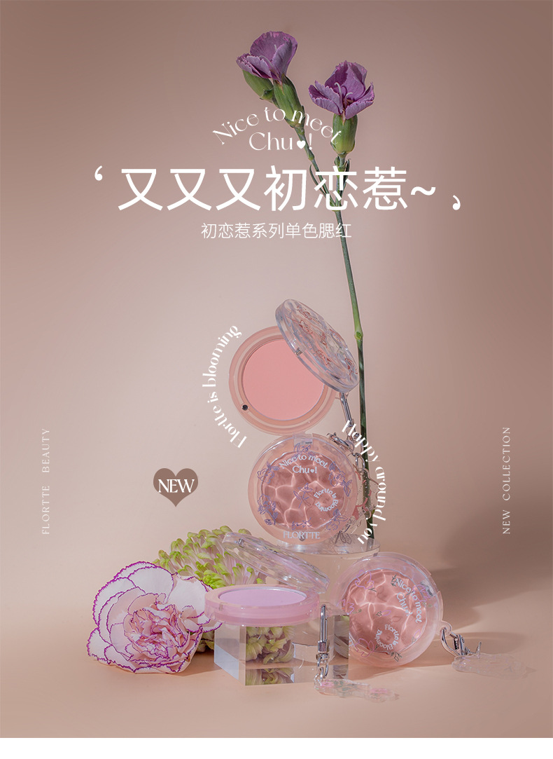 FLORTTE花洛莉亞初戀惹系列單色腮紅質地絲滑,易於暈染,低飽和度的色彩組合營造出自然的紅暈效果,給你害羞女孩的自然腮紅妝效。