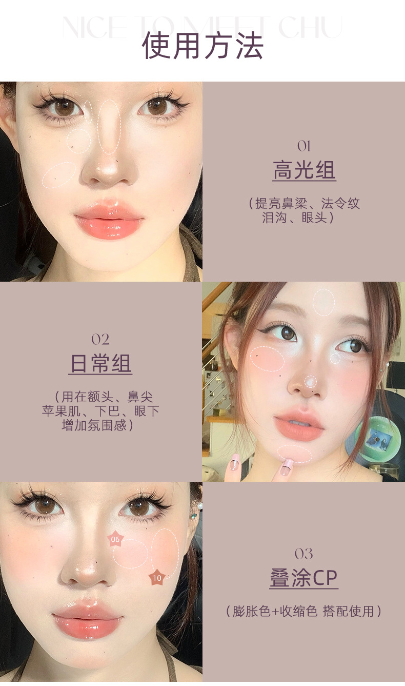 使用方法:取適量本產品,點塗於面部位置,用指尖或化妝刷輕輕暈染至達到理想效果。