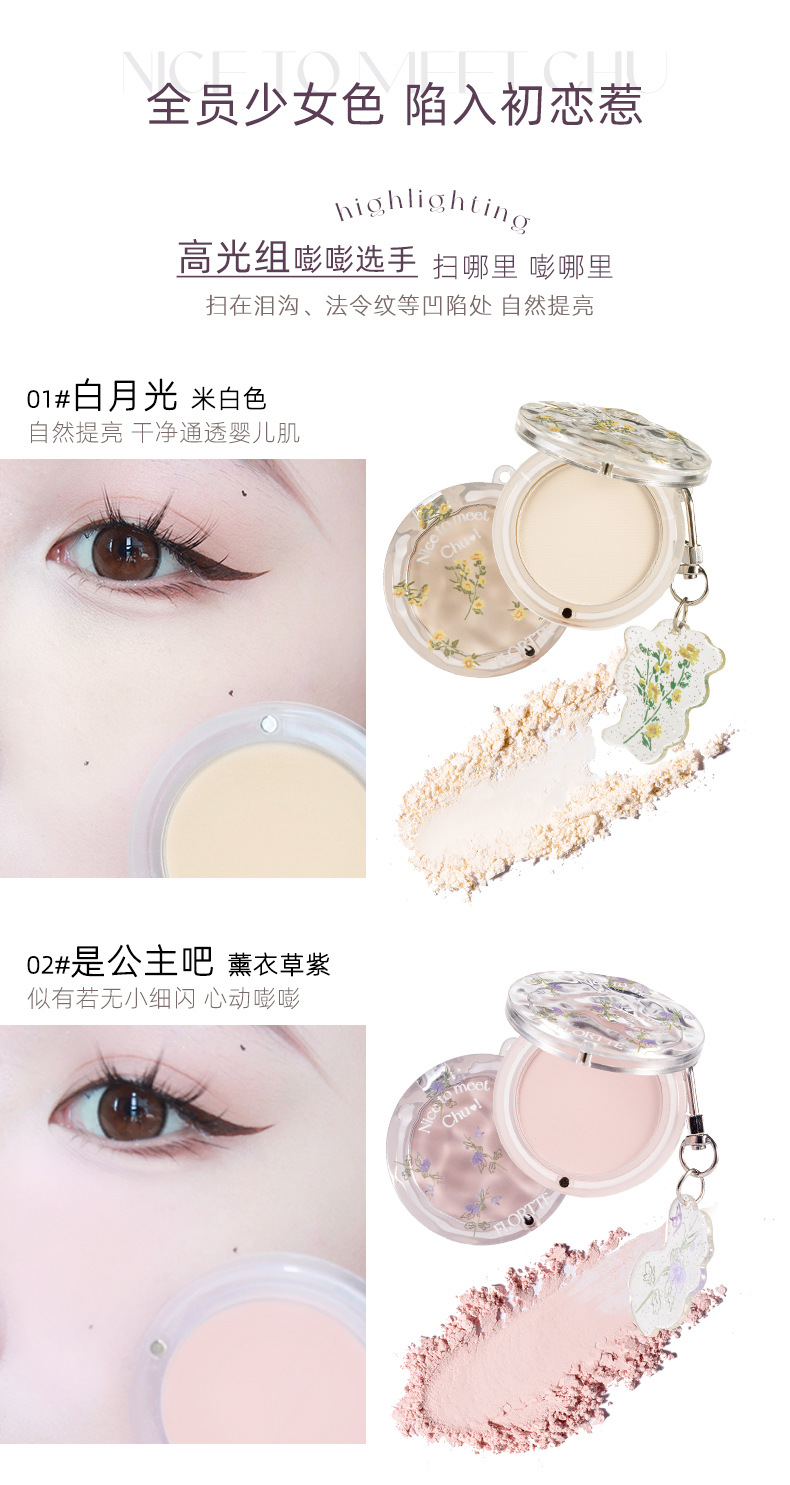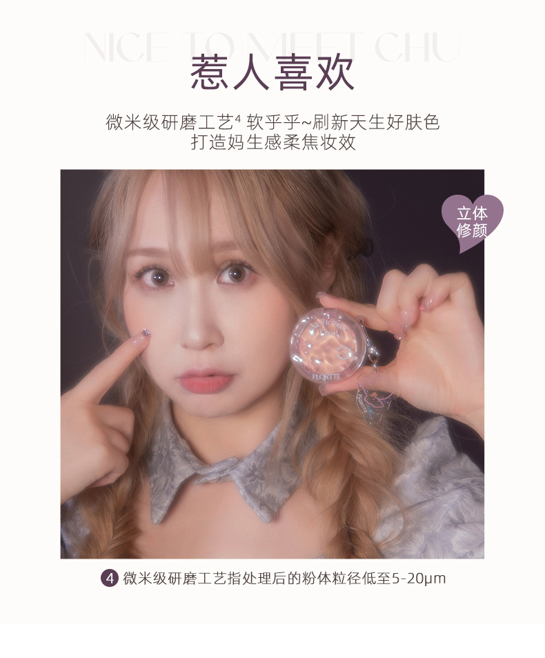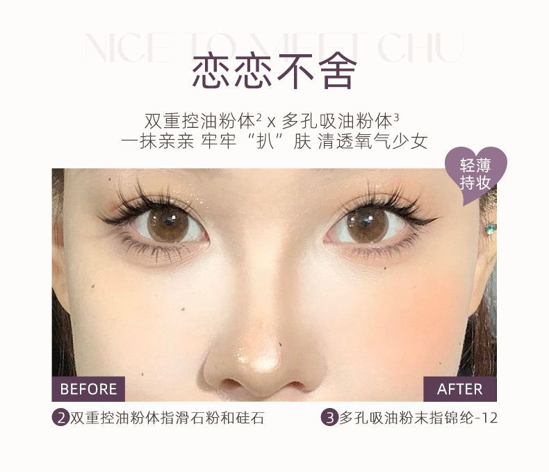 特點與功效:產品采用微絨雲母制成,質地輕盈,柔焦自然色彩,含有多孔吸油粉末,細膩透明,易於營造甜美氛圍。