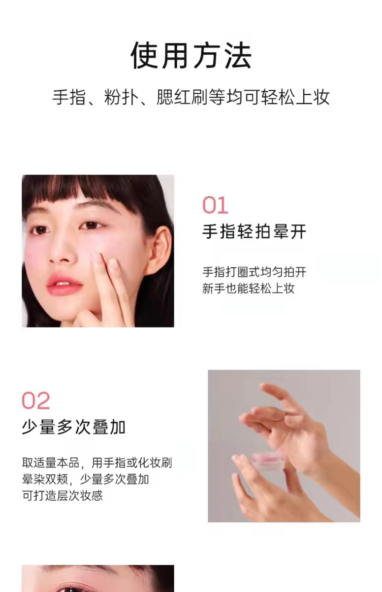 🎨 易上妝,適合初學者:無論你是化妝新手還是專業人士,這款腮紅都具有高度飽和度,方便上妝。可疊加的遮瑕效果,讓你輕鬆打造所需的妝容強度。