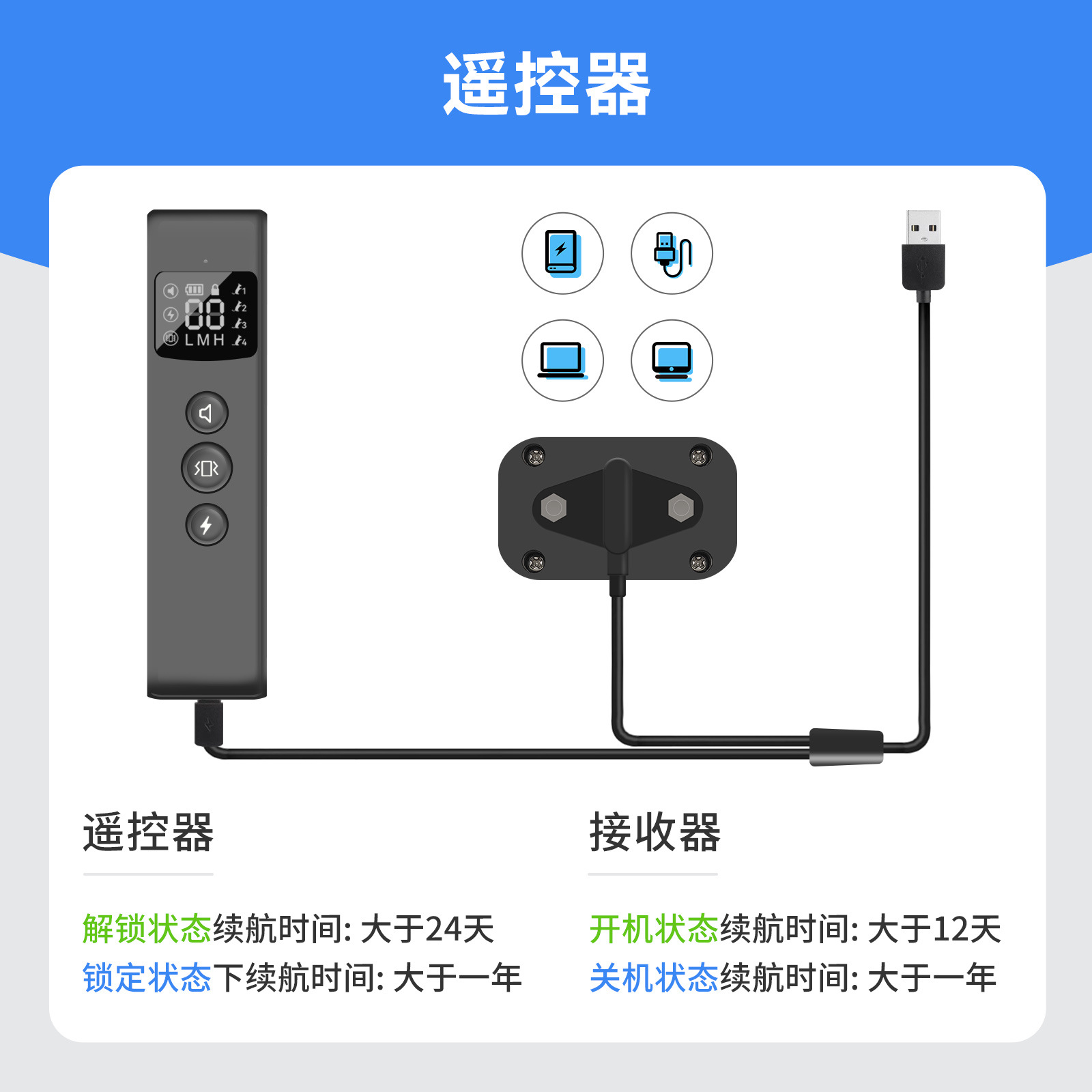 遙控器:解鎖狀態下大於24天;鎖定狀態下大於1年